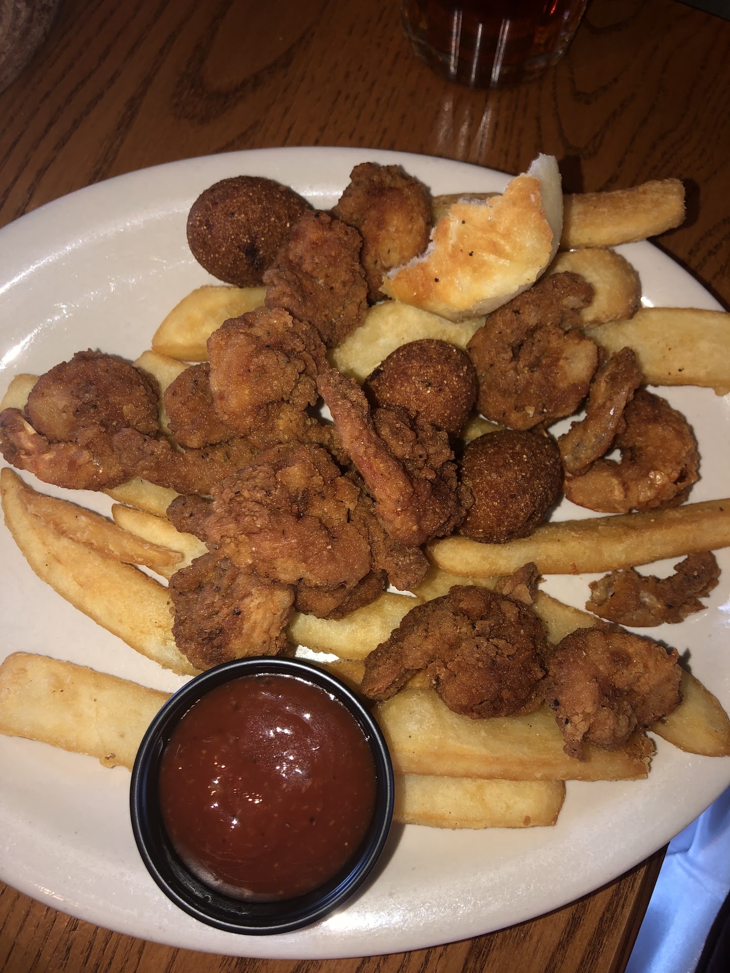 We finally get to the table. We decided to split the Tips, Tenders & Shrimp sampler. Our waitress must not have liked that idea as when we said that, we got a curt "Ok" and took our menus. It took a bit for us just to get our drinks. When asked during ordering, we requested cornbread and rolls. There were two of us, so we figured we'd at least get two of each. Wrong, we got one of each and then when we requested more, the waitress had an attitude with us again about the meal only coming with two bread. This was never stated by her or anywhere we saw on the menu. I don't remember if we got charged for the 2nd basket of two rolls or not. They sure loaded up the basket with 10 butters for two pieces of bread though. I don't know what the policy on bread is now, but I do remember getting more on previous visits, typically at least two per person at the table.