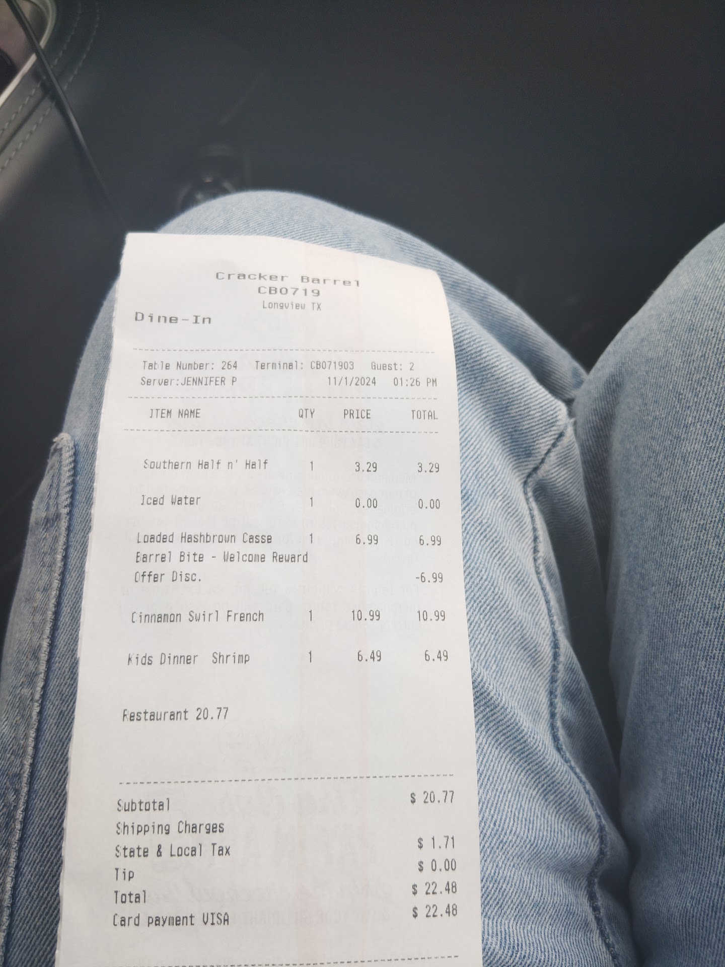 Went and got a country fried steak breakfast to go and an individual side of pancakes . Then i ordered two of their friday fish sampler . I asked sugar free syrup on app and when I got there they gave me regular . We asked for them to instead give us sugar free . They went to get sugar free and then tartar sauce as they didnt give us any of the sauces for fish . Got home and pulled out food and coleslaw was smashed because they put all 4 orders in one bag so when I grabbed coleslaw it had a smashed lid bending it so i was left holding the lid and coleslaw spilled all out everywhere . Like two bags was too much to ask for all this food ! Then i went to grab syrup and put it on my pancakes . Later my blood sugar dropped and i could not see for awhile . They didnt give me bottles of syrup they poured it in a plastic container . I didnt know they didnt take regular syrups out . How was I to tell which was which ? I figured they would have at lest taken the normal syrups out so that I know which was sugar free . Nope the stupid continues to dominate this place . Ive never in my life had so many bad things go wrong and its only this location in longview .I can write a book of how many stupid crazy rhings they mess up on . Its like they hire the brain dead people of longview . Im sorry but this place is a hard pass never going back . They forget meals half the time . Once they forgot two meals out of three meals ordered . Went back to get the meals and I was told they closed already .So had to go to another place to order food to go while they still had my money . Took 1 hour to get that one meal too .Said they would return money in the morning . The stories dont stop there theres over a dozen more !!!! So please if you get food to go …. Dont leave until you go through your order . Their chicken fried steak tasted like it was a frozen tv dinner was gross . Scrambled Eggs were overcooked to where it tasted like rubber . Fed my whole meal to my dog . Just ate pancakes which i now regret since i had a sugar attack .. update . Went to Cracker Barrel again and im telling you this place is crazy . Ordered French toast . I get my order and I tell her no I needed the sugar free syrup ( already told her in advance like always do at any restaurant). She comes back and tells me they are out of sugar free syrup , but that I can purchase a bottle in their gift shop...
