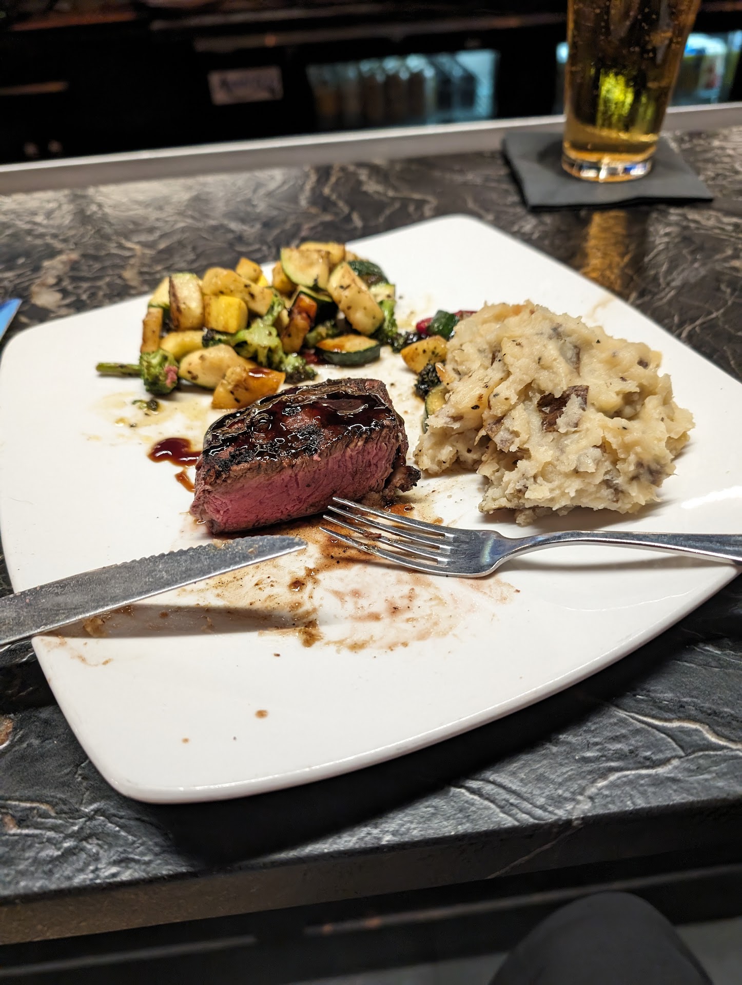From this point forward, they took great care of me. Love that you can choose spring mix for the side salad instead of traditional lettuce! And it comes with hearty shreds of parm. Everything was fresh. I ordered the honey orange glazed grilled salmon served with jasmine rice and grilled veg. I was expecting the salmon to be grilled, but it seemed more steamed? And it was not at all dry, very tender and juicy, but cooked through instead of medium or medium rare, but it was delicious nonetheless. There was something off about the glaze; it's possibly normally yummy, but it had a weird taste - maybe burnt? Anyways, I scraped it off, and everything else was a treat! The jasmine rice was spot on in terms of texture and flavor. The veg had onions throughout which was a nice touch and the seasoning was perfection. I ate every bite! The manager came by at the perfect time to check on my experience. I did not say one word about the glaze, because I did not want to complain twice in one visit! Normally I would politely mention something like this just so they know.