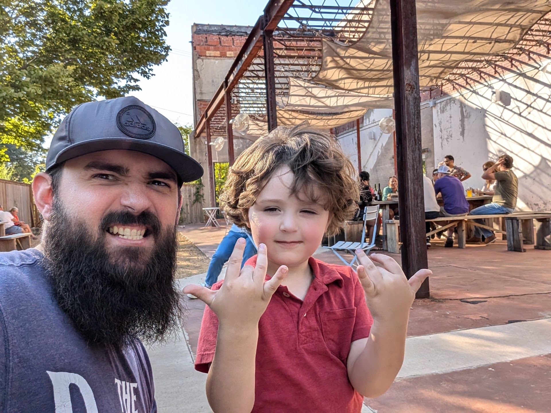 Cool atmosphere outside with a place for kids to play. The train rolled past twice while we were there. They didn't blow the train horn, but the rumble was still loud enough to prevent any conversation.