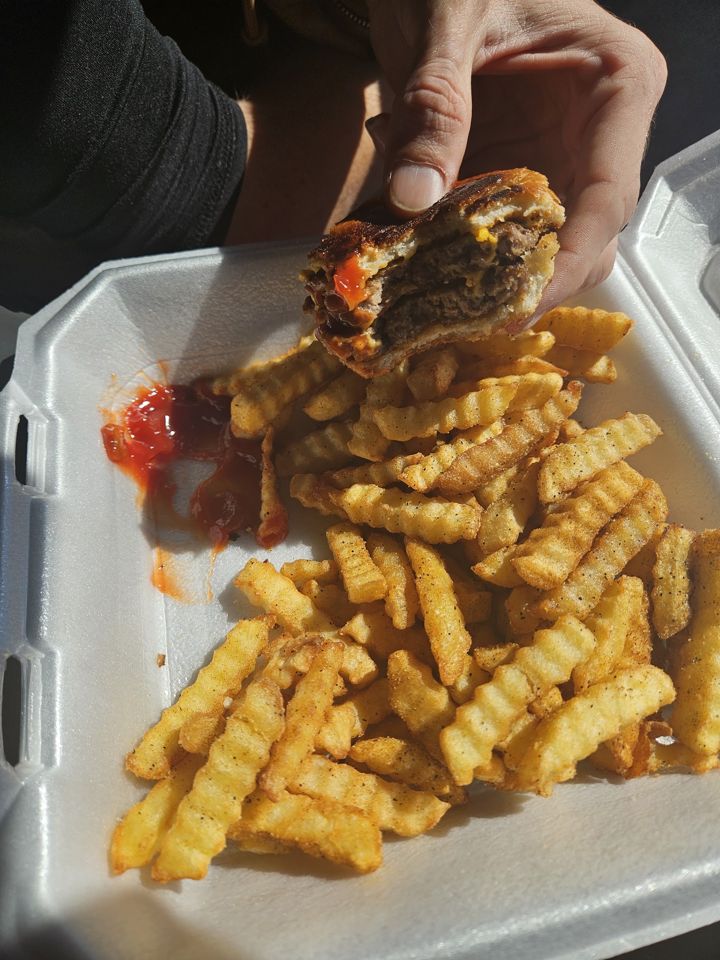I wish I had taken pictures before we started eating, but I don't usually post reviews, so I didn't even think about it. Bf ordered a DBL plain(so basically a plain double meat burger) and I ordered a lamb gyro. We both got fry and drink combos. Our meals were just under 10 dollars each.