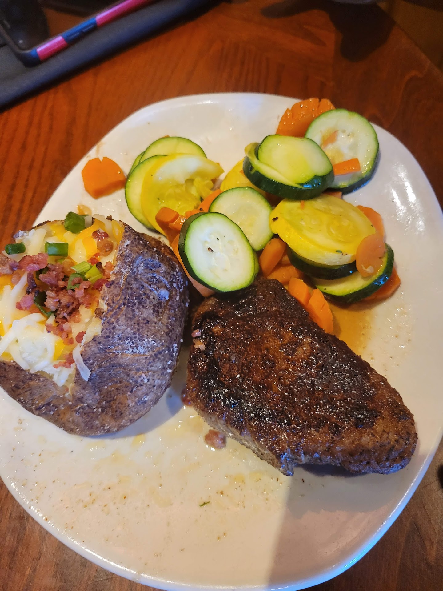 I donât really frequent Outback, but when I came before, adding a lobster tail to your meal was $7.99 - it is now $15.49. Our waitress literally put it in and saw that the filet mignon and lobster at $35.99 was the cheapest option to get lobster added to a steak. So thatâs what I ordered: filet mignon (medium rare) and lobster, with a loaded baked potato and broccoli. My husband ordered a ribeye (medium rare) and grilled shrimp, with loaded baked potato and the Caesar salad. My son ordered a sirloin (medium) and coconut shrimp with mashed potatoes and âseasonedâ rice. None of our steaks came out right - mine was over and both my husbandâs and sonâs were under. My husband and I wound up switching because rare, bloody steaks donât bother me. My lobster was great, but their shrimp was not - the grilled shrimp was over-seasoned. The Caesar salad was fine, but I think that there was some form of horseradish in the dressing which was surprising. However, all of the other sides were cold. Both potatoes, the butter wasnât even melted under the sour cream and cheese. My son said (and my husband confirmed) that the rice âtasted oldâ. After I saw how much we were charged for our food to be so subpar, we skipped dessert.