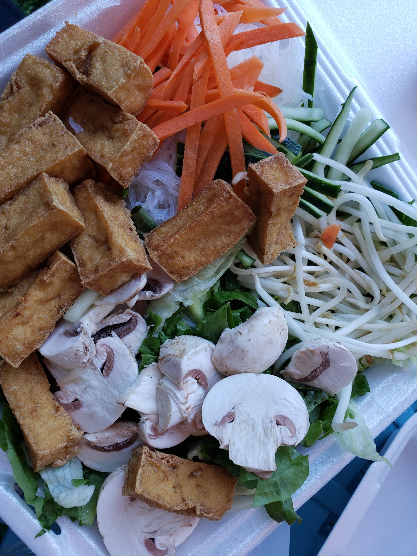 this was not that. do not come here if you're looking for anything near that. we ordered to-go and trusted the reviews enough to not feel the need to open everything until we got home--what a mistake. what we got was some weird american salad with some rice noodles thrown in. everything was raw except for some flavorless fried tofu that didn't have a single hint of seasoning whatsoever. nothing cooked, nothing seasoned, not one bit or taste of lemongrass or basil or any kind of vietnamese flavor anywhere in this dish. and not a single piece of onion or garlic or anything to be found...what is this? and that is indeed iceberg lettuce you can see in the photo that served as the base. whoever thought it was a good idea to put iceberg lettuce in a dish served as 'vietnamese cuisine'??? also note the cucumber slices which are more peel scraps than anything. literally what you can see in the photo is what it tasted like. nothing else.