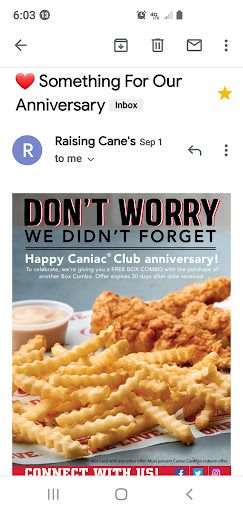 Read moreI had a buy one get one box combo for Caniac Club. The kids planned for 5 days to have Cane's on Monday. Got off work and went through drive thur. Ordered the 2 box combos and a 6 piece combo also. The girl scanned my card and said it was $30. I said it should be buy one get one free. She then said it was a point system and you earn points. I showed her the email and she said the internet was down so she never actually scanned the card. She would have to get her manager.