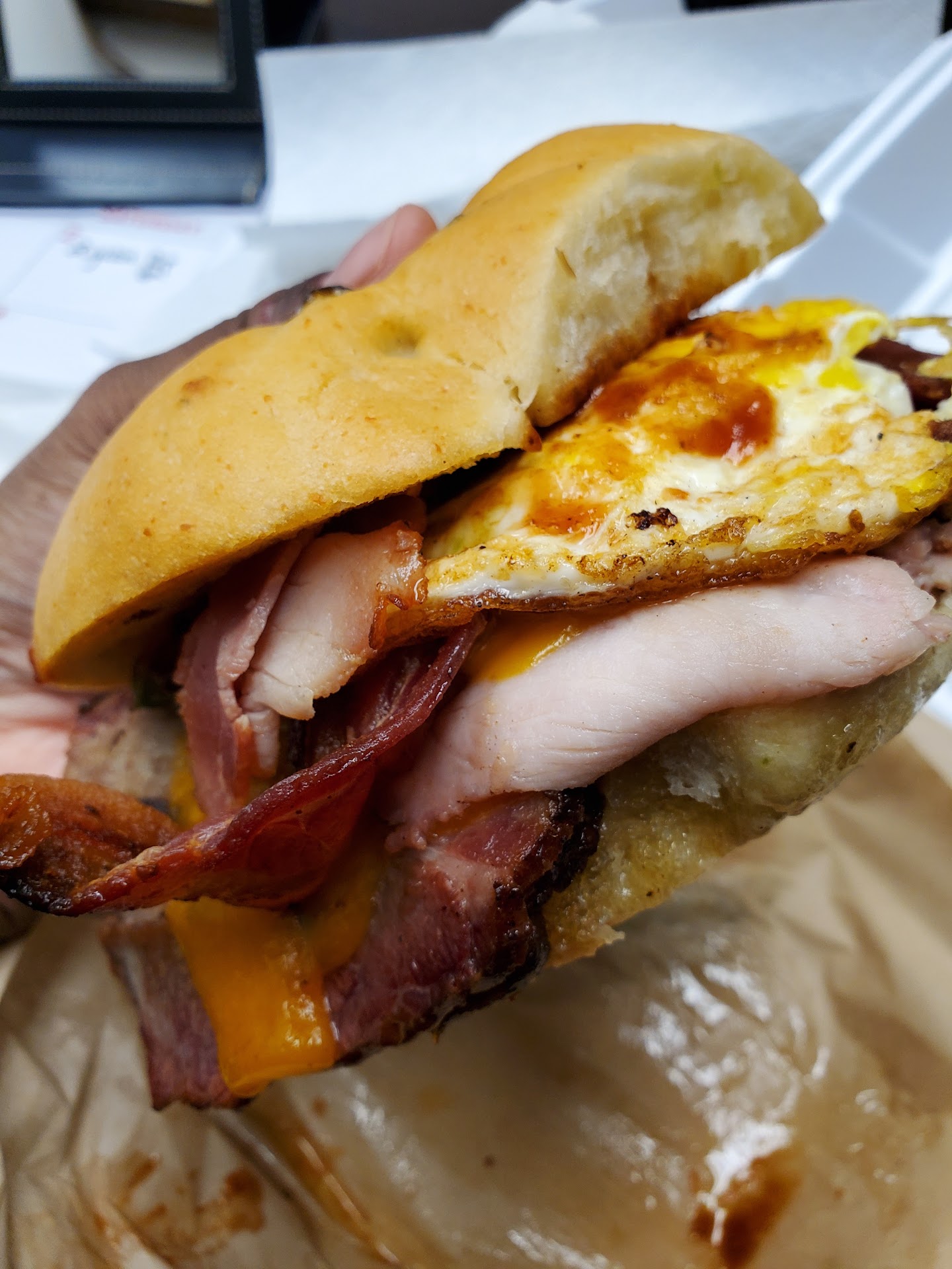 Read moreToday was my first visit and it did not disappoint! I've seen several of the Facebook ads consistently on my feed and had to try them out. Today I got the Rooster sandwich with potato salad. OMG!! So delish! It was seriously piled high just as described. You have the option of getting a half or a whole sandwich and I of course tackled the whole one! It is more than enough food to satisfy 2 people!! The jalapeño cheese bread was sweet and soft. The bacon was perfectly cooked and crispy! The brisket and ham were so juicy and complimented the sandwich so well!! The avocado and egg made it healthier and more delicious!!! The delectable bbq sauce will make your eyes roll into the back of your head!! It's a sweeter sauce. The potato salad was perfect as well. I will be satisfied for the remainder the day. I don't usually eat out because I am trying to budget better in my late 30s and get this adulting thing under control of course, but gosh I am SO glad I decided to see what everyone else talks about. The restaurant was clean and organized. I called to speak to the manager, Trevor, to tell him how much I enjoyed my food and he was so nice and appreciated the compliment. I will be back!! I'll just had to set aside a budget labeled The Roost over there with Trevor and the gang because I love it there!! Please go see for yourself! I'm no food photographer, so this was the best I could do whilst smelling and holding this beast of a sandwich. That...