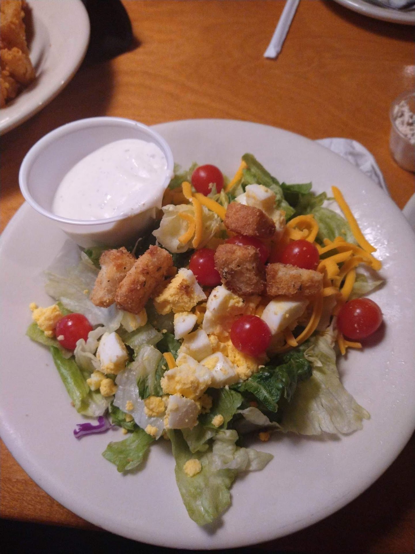 Country fried chicken was child approved! It was served with an absolutely delicious brown gravy on top and it was fried perfectly crispy. As for the sides there was a salad and loaded french fries.