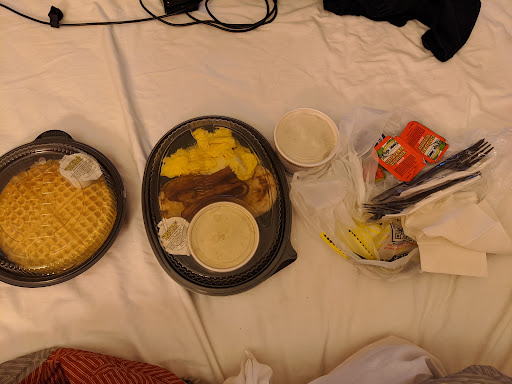 After a few awkward minutes, thinking I might starve if I don't speak up, I kindly asked for a menu. They gave me one, and I ordered a waffle and eggs breakfast, which came to me with no drink (they didn’t ask if I wanted one), and no syrup for the waffles.