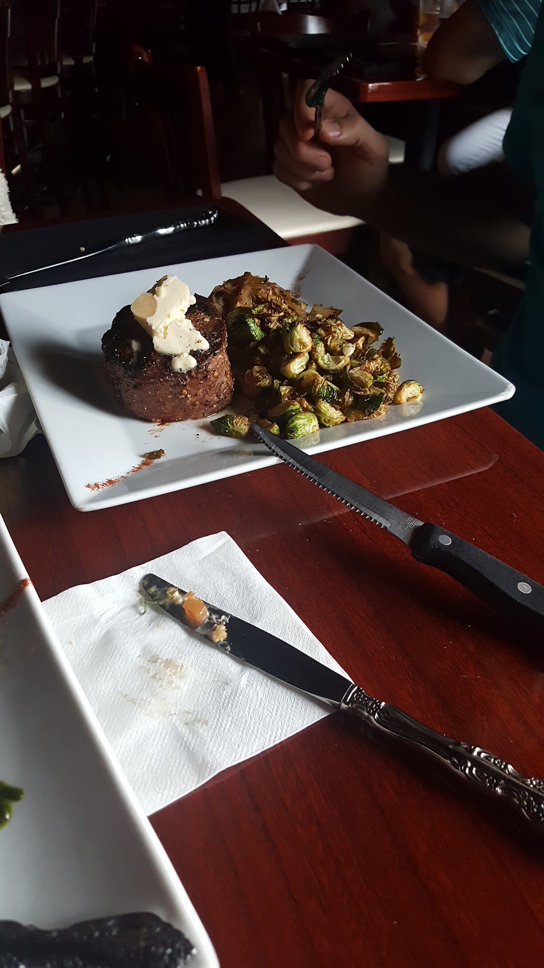 He also spilled an entire glass of wine and gave a bar rag for us to soak it up. He also didn't remove the bar rag after it. He also did not replace the soiled table cloth. He did not pre-bus the table, being a former service industry worker, I stacked everything to the corner, he eventually took it.