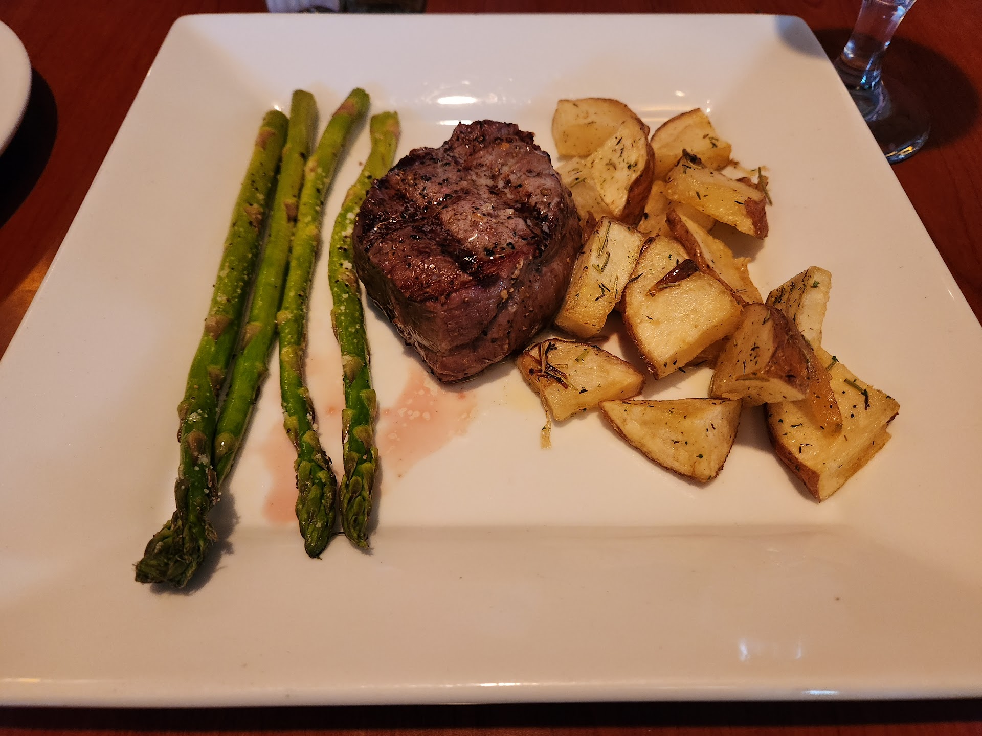 When the food came, the appetizers were fine.the potato skins seemed like they were cooked earlier then reheated before serving. The dish I got was a beer battered haddock, it was flimsy with no crisp, and did not seem to be cooked properly. The fries with it tasted like fish. The green beans were not cleaned properly. The asparagus was not seasoned at all. The shrimp tasted as though it was frozen earlier, then cooked in butter with chives thrown on it with no other seasoning. The steak was dry, it was ordered medium and no juice came out at all. It seemed like the veggies were microwaved and lacked all flavor and taste, not even salt or pepper.