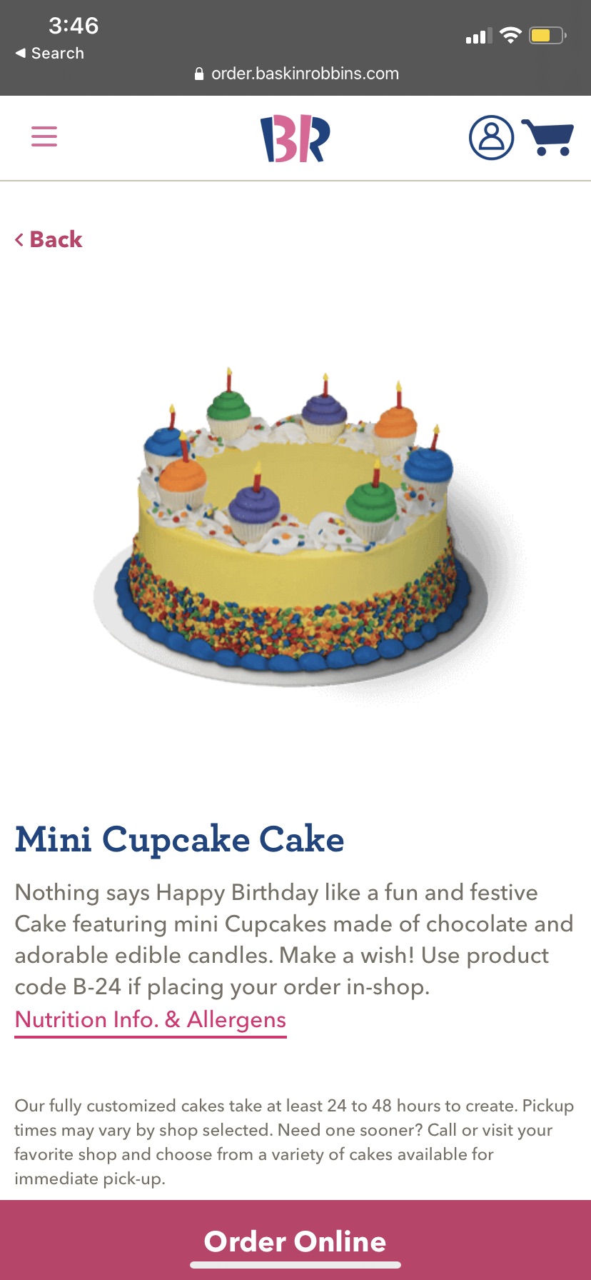 Ordered a mini cupcake themed ice cream cake on the 12th for my daughters CUPCAKE themed birthday on the 16th. Gave Sophia the cake number the website told me to give when I ordered, the colors I wanted and what I wanted written on the cake.