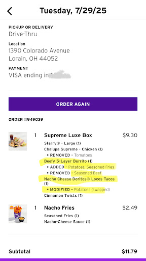 Ā Ā Ā Read moreI placed a mobile order last night, went to go pick it up took 20 mins waiting in line to get the order okay whatever it happens. Then I get my order pull out and take a drink of my drink and itās just soda water. Was going to turn around but I wasnāt going to wait another 20 mins just to get the through the line and the lobby was closed. Got home and I got a supreme lux box. My 5 layer burrito and my Doritos locos taco was suppose to have NO beef. It was suppose to have potatoās instead and it had beef. So I proceed to call and talk to HANNAH! She rushed me on the phone when I was trying to explain what was wrong like she didnāt even hear what I was saying and just said to come in and say I talked to HANNAH and get my order remade. I proceed to come in the next day, pull up to the drive thru speaker and proceed to tell them I had an online order last night that was wrong, I talked to Hannah she said to come in and get it remade. I proceed to tell them my order and then I get stopped and told that what I was saying was incorrect and that I called about the chicken chalupa being wrong. I said I called about two of my items in my box having beef in it when I specifically put no beef add potatoās. A chicken chalupa already comes with chicken why would that get messed up. They then proceeded to say well thatās not what Hannahās saying sheās right here and she said you said this. So at this point I told them forget it about it. Iām not about to beg for my food to made how I ordered it. Iām not going to sit here and lie about what I ordered to get free food I can afford to just order more food but itās the principle of being told Iām lying after what happened the night prior. Both ladies had attitudes and were not professional at all. I would not recommend this location at all and at this point Iām done dealing with fast food because half the time even when the food is correct itās still nasty. Some people just need to not work in customer service if they canāt be professional in that setting. They definitely could have handled...