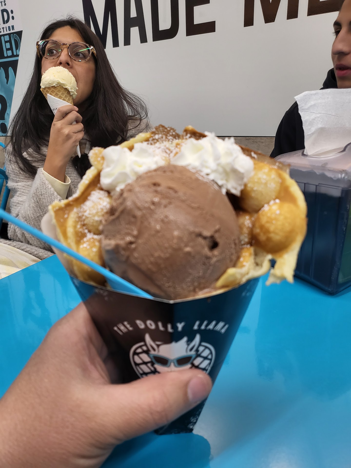 Adorable place on the inside!! Owners were very nice and helpful. The icecream was great but the waffles were AMAZING, so hot so fresh ( they make it right in front of you) I got the strawberry bubble waffle with Nutella and chocolate ice cream and couldn’t even finish it despite wanting to very bad. This place is new and hasn’t seen a lot of customers which I hope changes. We need this...