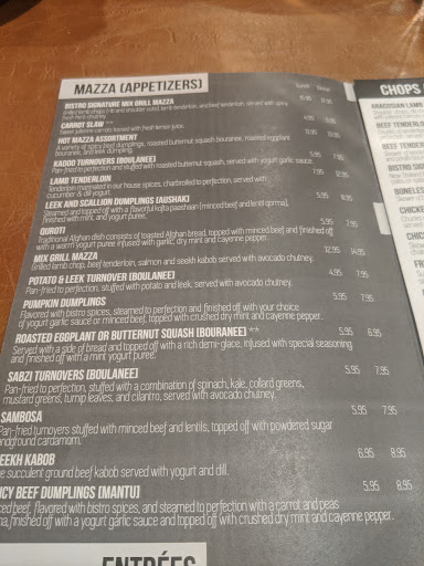 Read moreWow! This is incredible Afghan cuisine… fabulous! This Afghan Halal restaurant in an obscure strip mall just south of Springfield proper, is incredibly deceiving when arriving to their parking lot. Look hard and you’ll find it. But once there you’ll experience some of finest Afghan Cuisine ever – it’s no wonder Afghan Bistro has received numerous awards. The moment you walk in you are warmly greeted by this family-owned and operated homey and relaxed establishment. You immediately feel the vibe of the family surroundings. As for the food, Wow! Afghan Cuisine unifies much of the Indian, Central Asian, and Persian foodways and cultural characteristics. Every item of the many we experienced were exceptional! We enjoyed some of the best Sambosas ever. This minced meat stuffed pastry chalk full of tasty lentil gorma fried perfectly with slight toppings of powdered sugar and cardamom were yummy. My Wife’s fave, Pumpkin Dumplings, were superb. These delicately steamed with a magnificent stuffing of minced meat, lentil, tender and flavorsome butternut squash, seasoned with mint and cayenne were superb. My selection and I am tremendously pleased with it was the Veal and Mushroom Sabzi Lawaan. Marvelous taste, stupendous preparation, and an amazing presentation of this veal fillet in a yogurt-based stew of greens, mushrooms with cilantro. Everything was served with an amazing saffron-infused basmati rice like I’ve never had before! If you love Afghan Cuisine or if you’re new to it, this is the...