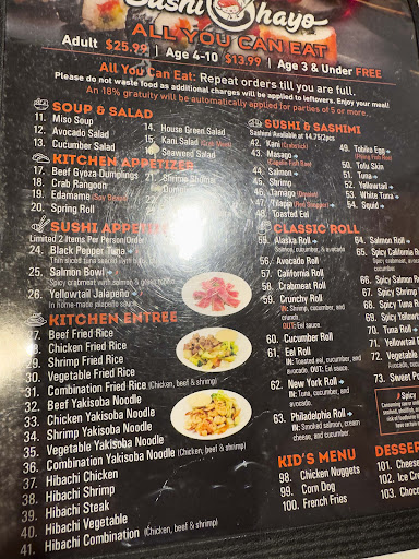 Read moreYou get what you pay for. The service is friendly but needs work with communication and speed. When you buy the "All You can eat," pricing the portions are small for like a child but the positive is that you end up ordering the same dish again or something else. The flavors weren't that great when it came to the Beef Yakisoba and the chicken version was just okay. The hibachi beef is lacking in flavor and in veggies, to the point that I only got one mushroom with my veggies. The server was hard to understand and she barely understood us, she just knew how to take orders. At least she was friendly. Moving to the Sushi, I don't recommend this place at all for sushi! You are getting cheated here. I ordered sushi here to go once before and I thought it would be different eating in, but I was wrong. I ordered the spicy salmon and the spicy Tuna and neither were spice or good. They don't give you a full slice of the fish in the roll, what they do is give you what looks like a grounded mush of fish meat with some kind filling along with very little red peppers. Not worth the money and I feel cheated. The Gyoza is fully fried but good, and the spring rolls are good also. Just know that they are really small. The desserts are just as lacking, we ordered the chocolate moose and it was big enough for my 7 year old daughter to get but for an adult it would be two scoops and done. Plus it taste like a chocolate flavored whip cream. We also got a chocolate ice cream that looked like they bought it at a nearby convenience store. For the price, this place has decent food if you are looking to eat a lot. It's more of a family friendly buffet restaurant. As for the quality, it's a miss for me. Friendly service but not...