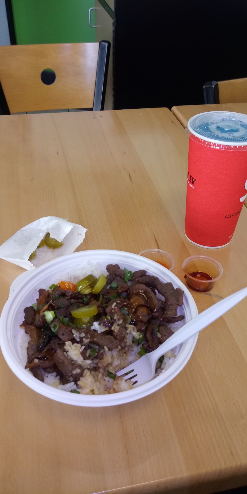 Read moreI give it a 5/5 because they have great food and I came out of it with a fun story. To give a little context the employee was (wo)manning the front and she had a line of customers as well as a nice elderly lady sitting down. This elderly lady was definitely hard of hearing because as the employee was taking an order for a customer, the elderly lady yells out "this table is dirty!" Now it was to the employees surprise that the lady yelled this out and she looks over at me and I am looking at her, and we make eye contact and try not to laugh. I look over at the elderly lady's table and there is one small crumb of delicious forgotten beef. What made this even better was the elderly lady choose to sit at that table out of all ten or fifteen tables available to sit at. I was the only other person sitting down. And that is why this flame broiler gets a 5/5. Also the meal was like 9 bucks for a bowl. So just an FYI it's kinda pricey for some beef, rice,...