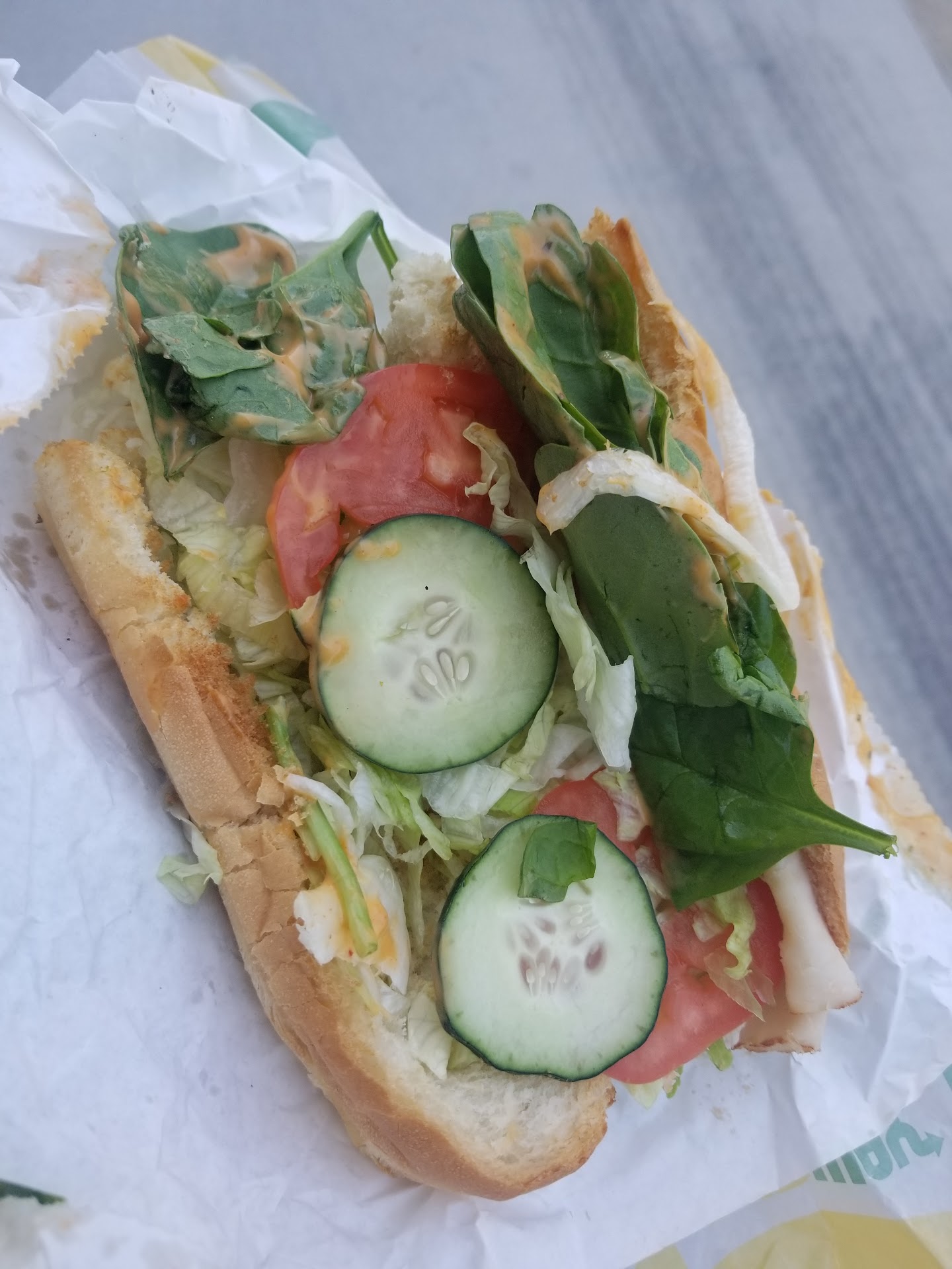 the sliced tomatoes were the first thing I noticed. the tomatoes were almost white, the way they lose their redness after they've been sliced and left in the fridge for too long. the bread was stale. it could be a week. if they allow the bread it get hard, how old is the meat? And then the sliced cucumber was a little too flacid the skin was wrinkly and coming off, and I know that doesn't happen just over night. I included a picture. I'm not a person that complains. the owner is probably purchasing too much of everything at once. And then they must be saving on cutting and baking everything at least a week ahead of when you order it, could be two weeks. if you own this place, let me know when you turn it around. and in the meantime, if you're a customer and you've gotten sick after eating here, please call the county health department and let them know. I think I'll be calling them...