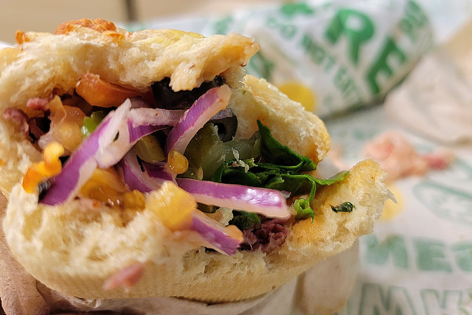 Read more"Big Hot Pastrami" seemed on a skinny diet (reminds me of the 80's Burger King commercial: "Where's the beef?!") i.e. a bit light on pastrami, about 30-40% deficient, with fibrous connective tissue that cannot be chewed. :P (Ick. Photo shows half of it.) Imagine cold, fatty pastrami transferred straight to the bread (cold night)--NO, sick! Had to ask to have it warmed up (!) (The Subway down Seal Beach Blvd loads it up, warms it, good quality meat, no fibrous yuck.) Jalapeno cheddar bread was light, fresh. (I usually get it wrapped, great for a hike.) Young duo working end of the night, poker face, wouldn't hurt to smile or show some enthusiasm, yes? No cups for water. Clean enough. (Did not use the restroom.) May come back for a bigger, hot, quality pastrami one, wrapped. (No longer hangry but, dang LAHS theater tech kids, working 3 hrs...