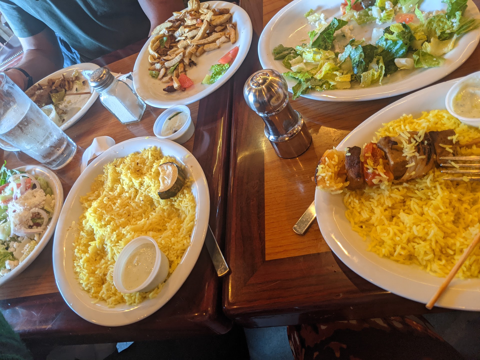 Read moreBe aware - the food got unrecognizably bad - at their new location. It was my bd - we ordered two kabob plates, both kinds of gyros and chicken with rice. Well, I tried to figure out what was in my kabob - chicken or beef - it would be better described as over processed hotdog cubes that resembled spam meat that was grilled at some point but got reheated in oven or microwave later with some wilted vegetables. I never had kabob that had some kind of unrecognizable ground meat in it, when you expect solid chunks?. The gyro lamb wasn't better either, and all three gyro dishes came with some old shriveled green skinned potato fries (yes, the ones you supposed to not eat). They tasted very bitter and all three sets were not edible. Third, the chicken rice dish - our chicken came shredded, loaded with lemon juice taste to cover up chicken being old. And the rice - it wasn't good either. It definitely looked good and yellow, but had no flavor and looked like they used the most cheap basic rice you can find - no traces or jasmine or basmati. The only thing we could eat without discomfort was some store bought pita bread and yogurt dip that unfortunately did not fill up our hungry belly's. And to add more pain to experience, their seating was crowded with just a foot between the table and chairs, bearly any passing room around us, we had to get up to allow wheelchair person to pass by. The server just brought us food and disappeared, serving entire restaurant with us trying to get any attention. He also spilled beer on the adjacent table on family with a baby in the stroller when serving. The suffered family decided to move to different table, instead of leaving. Think twice and save your money - any drive thru food is better than this in this town. I would at this point drive an hour someplace else than be resorted to this. Definitely wasn't the best place to make your...
