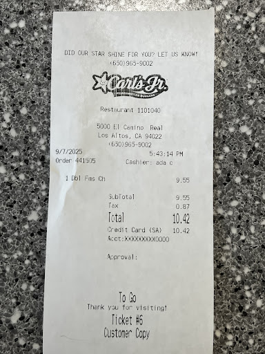 Read moreAs we parked the exterior, parking lot have is a bad vibe because it was run down and there were no customers. We get inside and the management hassled is over wanting a vegetarian option. Charged us $6 for three cups of water and then failed to bring one of our items with our meal. So the napkin holders on all tables were empty. Staff was combative and on edge as if something was amiss, just a weird feeling. Horrible experience overall, something is very wrong with this location. Usually Carl's Jr. Is a pleasant experience, this one was...
