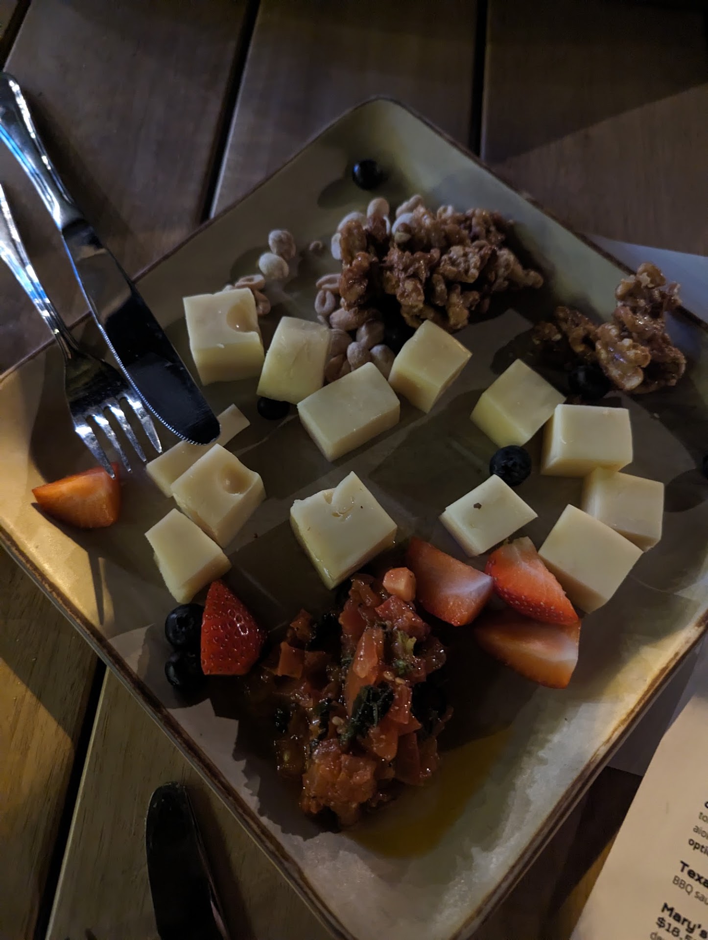 I ordered the pork shoulder and shared a calamari starter with my wife. The pork shoulder included rice and steamed vegetables. The rice was dry and not seasoned to any appreciable degree. The steamed vegetables were very bland. The pork shoulder was pretty good with a well-designed salsa topping that was the highlight of the meal. The pork could have easily been marinated or spiced to a greater degree and was fairly plain without the salsa topping.