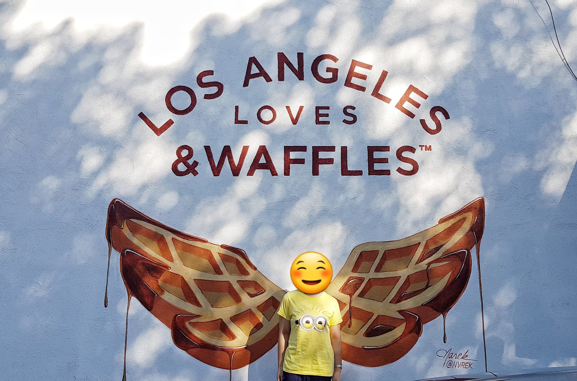 There is a photo spot on the wall outside &Waffles where is painted waffles in a couple of wings shaped with the text "LOS ANGELES LOVES &WAFFLES".