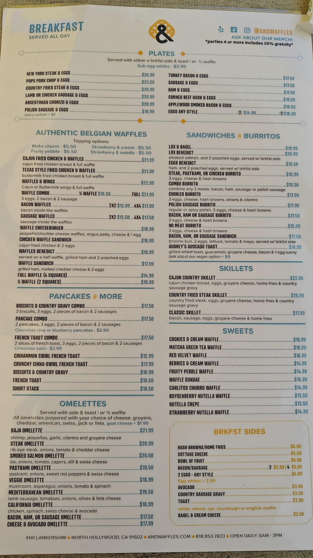 Ham & Eggs, Bacon & Eggs, Belgian Waffles, Pancakes, Omelettes, Sandwiches, Burritos, and many more. The waitress is so friendly and informative. She could explain us clearly about the menu. And as the common American restaurant, &Waffles also serves free cold iced mineral water.