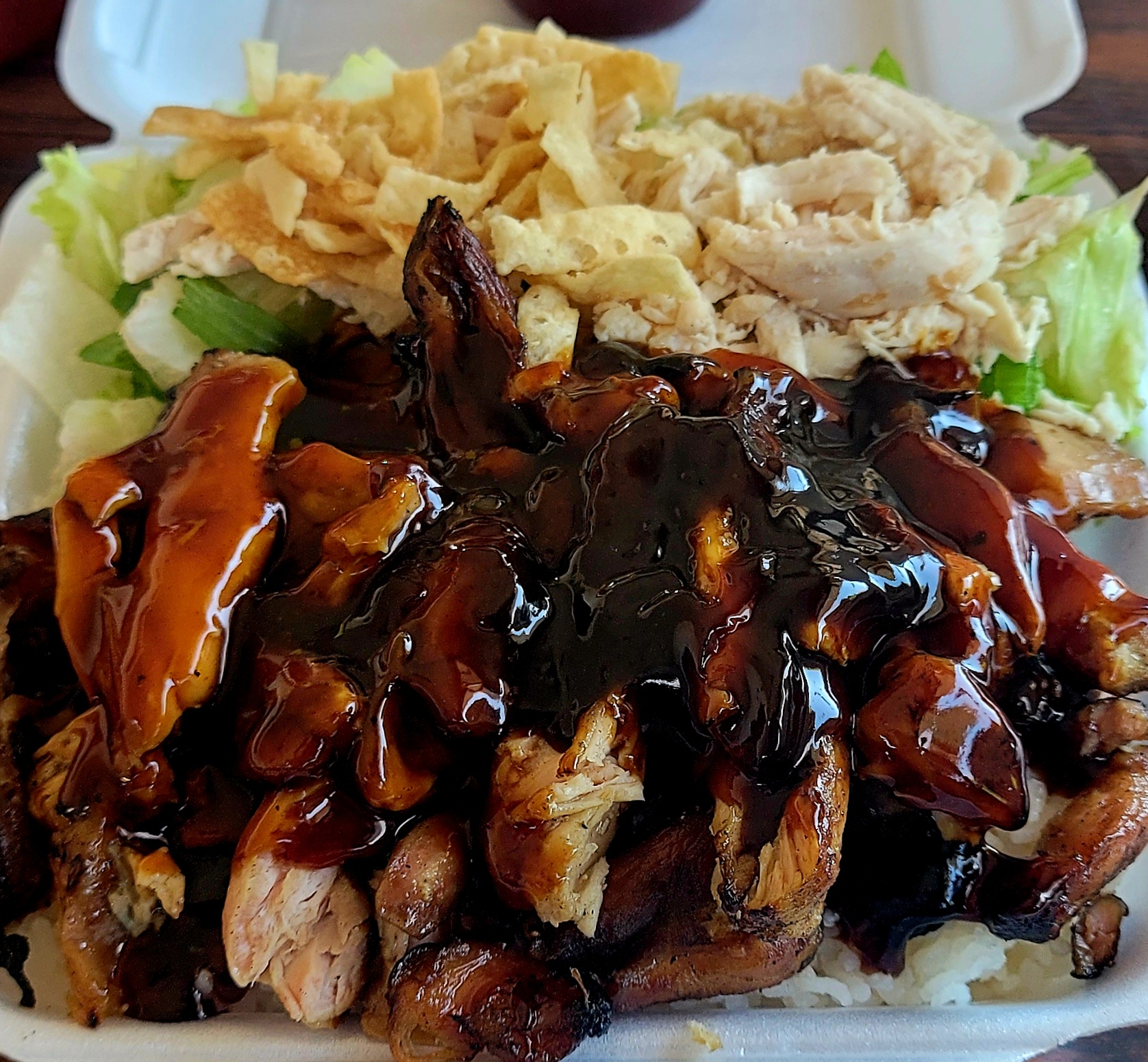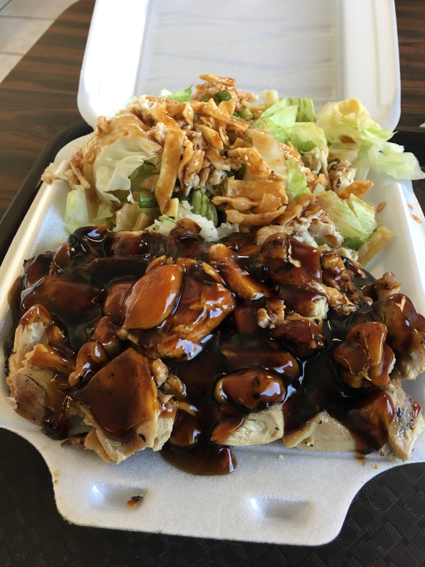 Read moreI had the Chicken Teriyaki over rice with Chinese Chicken Salad. The Good: I enjoyed the flavors with plenty of teriyaki sauce like I like it. The salad dressing was very good and the lettuce was crisp and fresh. The rice was fine and tasty with the teriyaki sauce. I like that this is a family run business and the people inside were nice and hospitable. The Not So Good: I did Not like the Chicken in either dish for two different reasons. Somehow the chicken in my Chinese chicken salad looks & tastes similar to what I get out of a can at home. The chicken they use for the teriyaki bowl was tasty for the most part but way more parts of the chicken than I would have wanted. The pile of Teriyaki smeared bits of chicken I had to spit out or just refuse to eat was too big. I would have gladly paid more for this dish had it been made with chicken meat without all the skin and cartilage and gristle. Having a go at a old school game like Galaga is worth a quarter but sadly I Do Not...