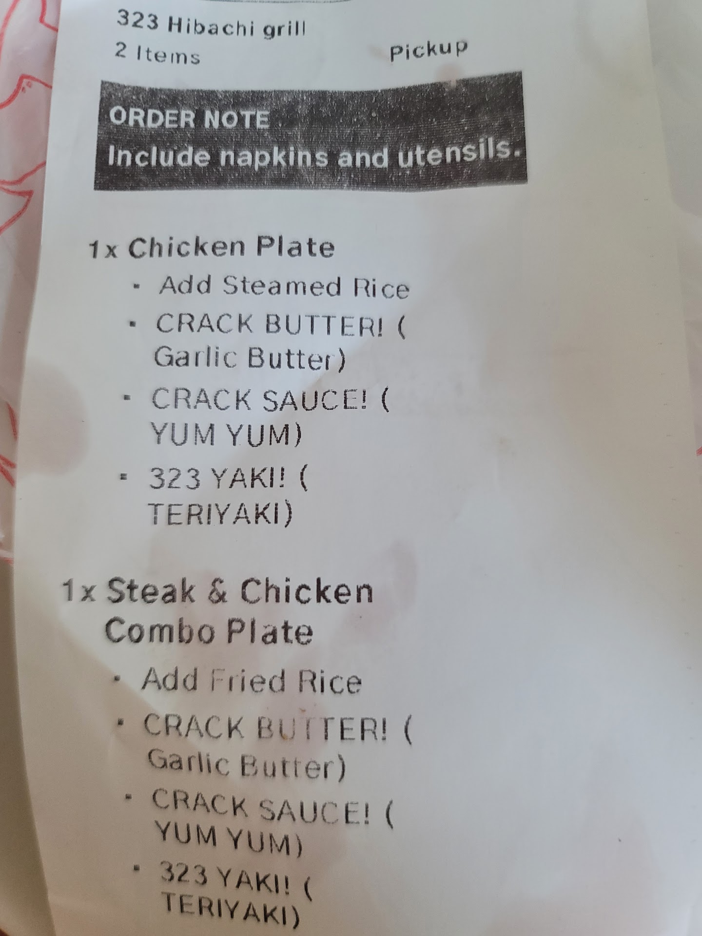 Read moreThis place used to be good! This was my first time back in nearly 3 years. Man, I should have listened to the reviews and ordered elsewhere. I ordered the BOGO chicken plate through Uber Eats pickup. It took about 45 mins to get my order, which I can dismiss since it was during their dinner rush. The chicken was extremely dry and had zero flavor, veggies were lifeless and appeared to have been cooked twice. I only received one garlic butter for two plates. When, I asked for extra yum yum sauce, they charged $1 each. Which I don't mind paying for if the food is good. However, even with the extra sauce, it was absolutely painful trying to finish the plate. I never waste food and I ended up tossing the second plate. It's unfortunate, because I live close by and love hibachi. I really want to support 323, but this visit will...