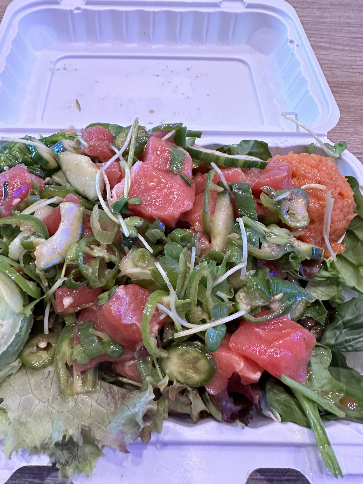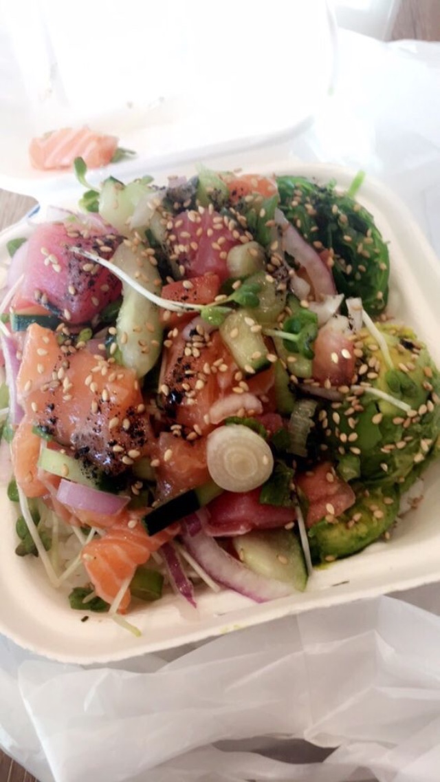 I tried rice, tuna and salmo, seaweed, avocado, the works for the veggies I recommend ordering the sauces on the side, it's a lot, I wanted to eat it at home, for dinner.