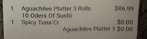 Read moreThe food is great here, but thi sis the second time I make phone order and they get it wrong. The first time I ordered the all you can eat to go, I wanted fried onion and fresh jalapeno slices and they gave me fresh onions with other veggies on order. This second time I ordered the aguachiles platter and I also asked for fried onion on my order an they got it wrong again. I was told by the employee that was giving me my order that it wasn't specified on the order or who ever took the order didn't put the receipt. So I asked who the person was that took my order was and said it Marisa or something like that and that she was the manager. Like she couldn't of made a mistake like that. She started giving me an attitude and said I had to wait 15min if wanted my order with fried onion like I had ask for over the phone, like it was my fault. So I waited and then after like 10min she comes back with my platter and asks if that's how I wanted my platter and said yes yes and mentioned again that that was the second I order and the same thing happened again ( why does it keep happening) and she has the nerve to tell me "well do you want it or not" and I responded " yes, it's me and my wife's anniversary and wanted to surprise her with this meal and I'm just getting out of work so I'm really hungry" so she tells me well you grab this at put what ever you want, which was the card reader for the transaction. I grabbed it put my pin and the it asks if you want leave a tip so obviously I put NO. Before I left I asked who the manager was and she answered the same name Marisa or what ever that name was, so that's how I knew that the person who took my order wrong or forgot to mention to them that I wanted fried onion with fresh jalapeno slices on top was the manager. I left pretty upset but kept my cool while was dealing with all this. That's the reason I'm giving the 3 star rating, because of the rude employee with the blue colored hair and the order being wrong twice. It must have been shark week for her and I dont think that's anyone's faul but like I said the food is great and the wife loves sushi so for that reason i would return to this restaurant but i would not want that same person to serve or give my order. Hope you all enjoy your meals at this restaurant and get better service...