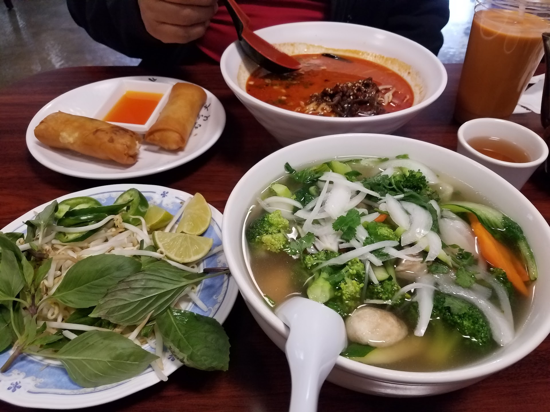 Co-worker got the Veggie Pho w/chicken broth for max flavor. They loved it. On both dishes, the noodles are perfect,veggies are colorful, crisp, and fresh. The prices are a couple dollars more than typical, but one taste and you forget about it (until the bill arrives, LoL).