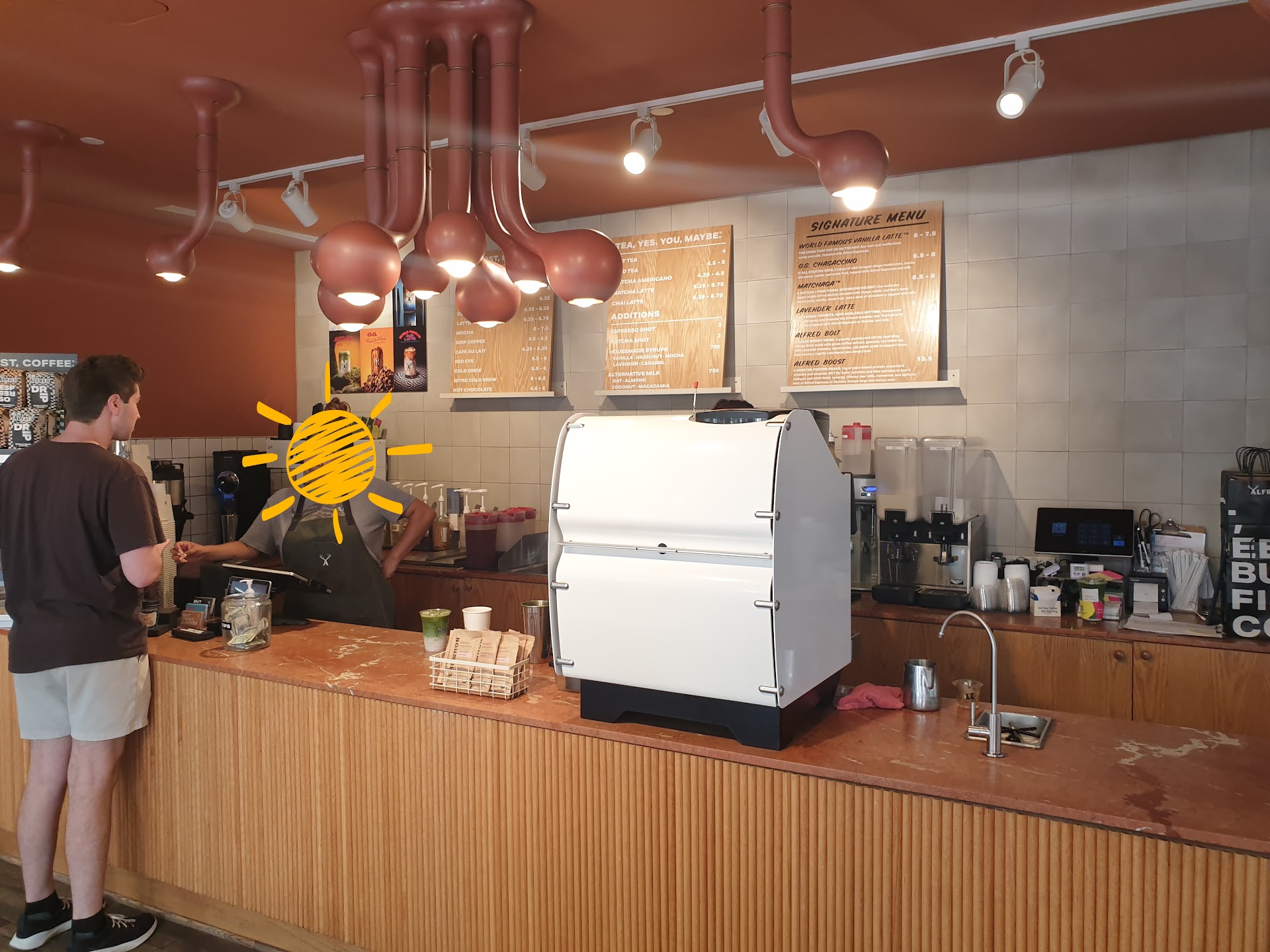 Read moreA friend of mine recommended I try Alfred’s and I just so happened to be in the neighbor. What a cute and great coffee shop!!!! I loved the vibes and the friendliness of the staff. I had the pleasure of being assisted by joseph. It was first time there and I wasn’t too sure what to get. I expressed how I’m not a huge coffee drinker and he recommended I try the iced matcha with vanilla and cinnamon. Believe me it did not disappoint! If you’re in the palisades area and looking for a cool refreshing drink, ask for Joseph he’ll point you in the...
