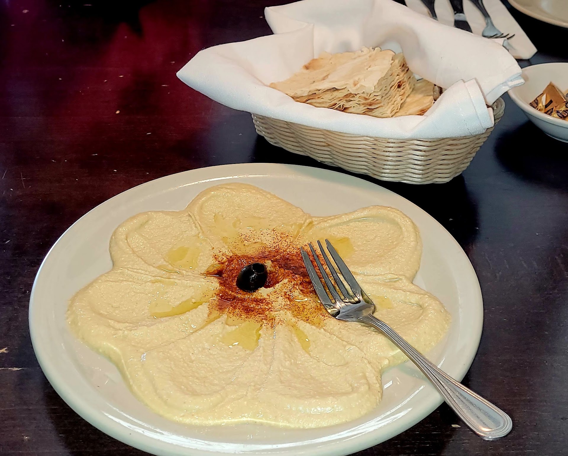 Hummus Creamy puree of chickpeas and tahini seasoned with lemon juice and garlic. Very good flavor. I love a good homemade hummus. I also like their thin, crispy homemade pita bread.