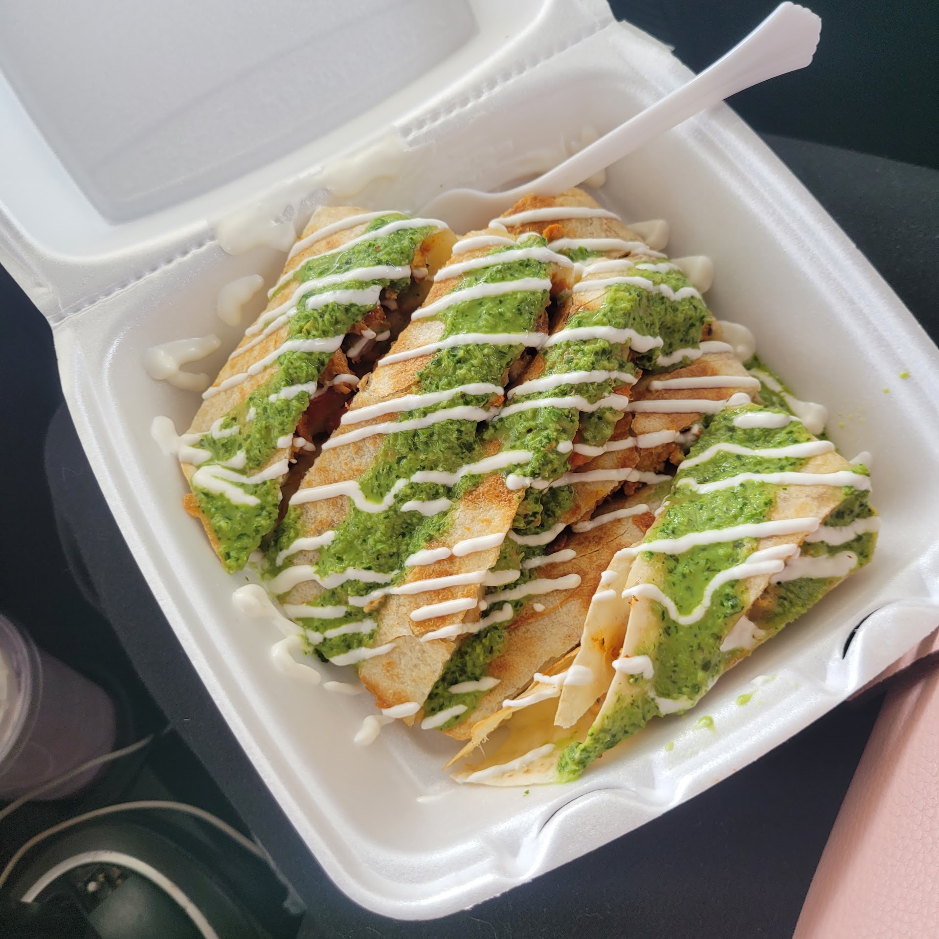 Food: The menu is small, so there are not many options. They provide tacos, burrito, and quesadilla. I got the loaded quesadilla with shrimp and chicken. One word delicious! The marinating of food is something I never had before. It's so flavorful. And don't get me started on their house made green salsa that they drizzle on top. Best combo ever. Not your average quesadilla. Definitely recommend getting anything loaded.