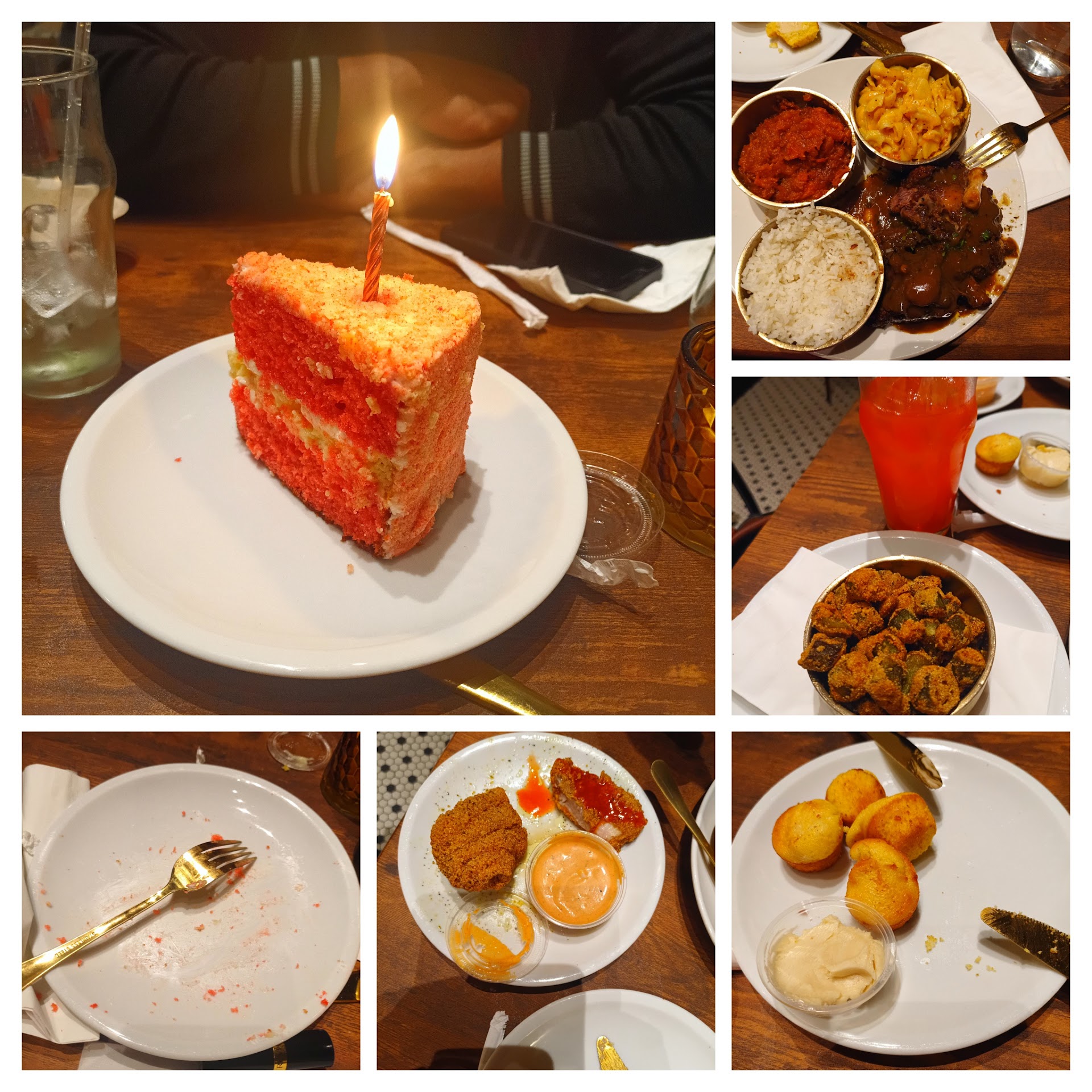 It was cool, it was the first time dining in this location. We were going to do a review but made it just a personal eat day. Nevertheless The sides and complimentary cornbread was the highlight unfortunately not our entre choices. We started off with the oxtail mac & cheese, egg rolls. There was no real meat inside of ours. It just looked like the mac & cheese was mixed in with little pieces I guess and it taste extremely tangy so I wasn’t sure why it tasted like that I don’t know if it was the sauce or some sort of cheese, overwhelmed it, but This was not the best to me or my man. The shell of it was good. Now the sides.. the Yams were tasty sliced up sweet potatoes, cabbage is braised and more of a vinegar flavor, red beans and rice, okra, and the Mac was really good as well, and the collard greens were all right. Now the entrées that we chose were not the best tasting for me or my partner. I had the shrimp and lemon pepper wings. And all honesty the shrimp was very translucent, even though it was fried so not enough batter, and my wings were supposedly gonna be wet, but the only wetness on the wings was actually the taste of freshly squeeze lemon on them literally so I did not finish them. My guy ordered the salmon dish that’s supposed to be stuffed however they ran out of the actual sauce, is supposed to lay in and served him the salmon alone, which just should not have happened because it just looked like a piece of salmon with some spinach mixture on top and it was very fishy like not cooked hard and he sent it back needless to say. (That’s when he was told they were out of all the other components) so it may hv been better if it looked like IG. If you like good sweet Kool-Aid with different flavor layers, then that is definitely there. It was too sweet for me or him to drink personally, but others may love that The mini cornbread were really, really good with the butter and that’s the breakdown of what we had. I also will have preferred menus that have been laminated or just a new printed sheet. Parking was cool. Found a meter around the corner and walked up. Music was a...