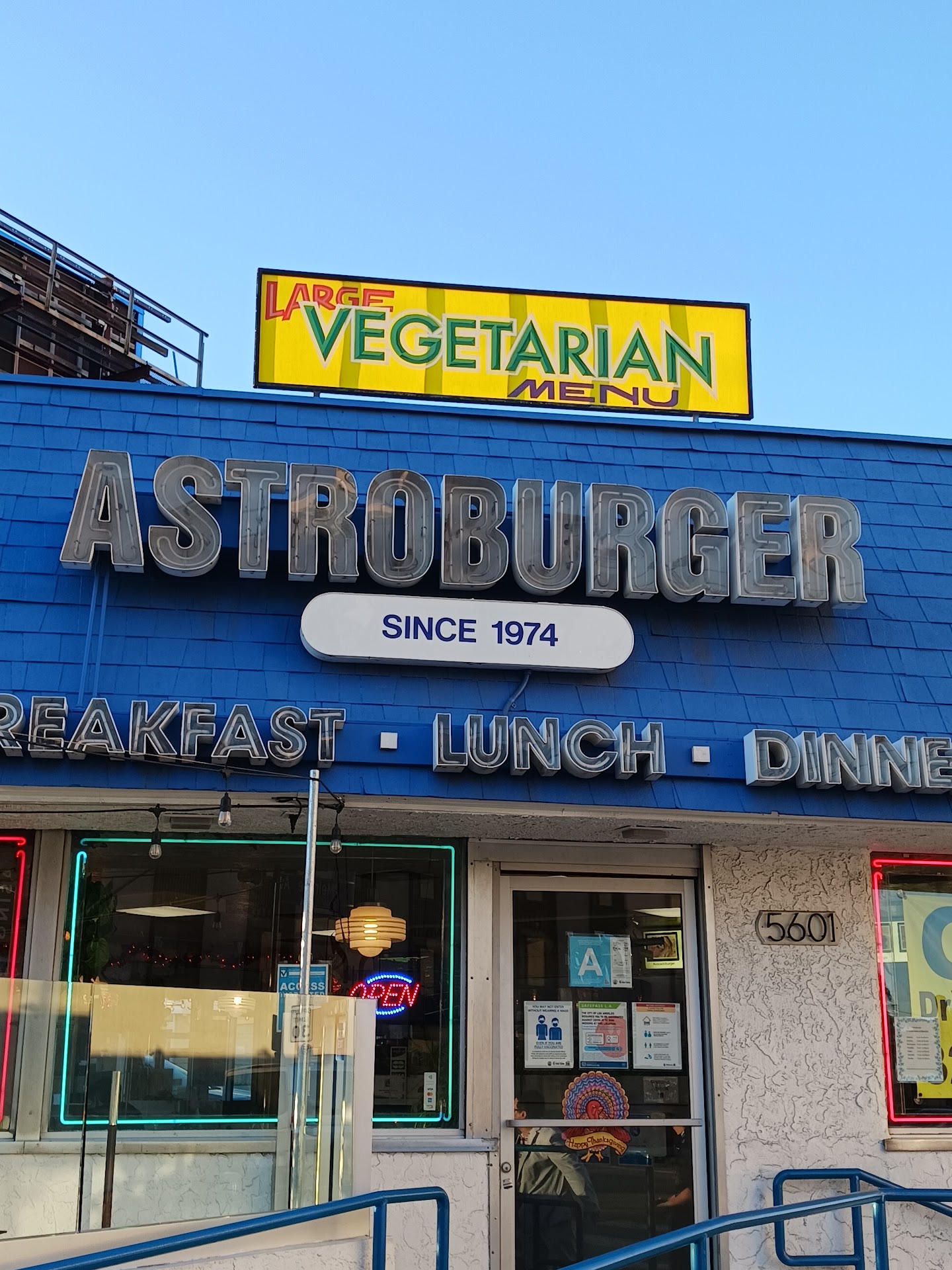 Read moreI’m so sorry I don’t like leaving bad reviews, but I got the vegetarian burger from this place via drive-through and I got the deluxe version. It did contain non-vegan cheese which I was aware of, but the patty was very cold. The cheese wasn’t even melted and there was about a 2-centimeter thick spread of mayonnaise on my burger like it actually made me gag because there was so much mayonnaise and I had to wait until I got home to wipe off the mayonnaise. It seep into the mayonnaise by the time I got home five minutes later and everything was soggy and gross. I actually ended up throwing the whole bun out and trying to salvage just the patty. It was really bad and the fries had absolutely no seasoning on them not even salt. And I paid nearly $20 for this meal. I wouldn’t go back. I used to eat at the Astro burger closer to West Hollywood which I loved several years ago. I used to rave about it until all my vegetarian friends to eat from here. I’m not sure if it’s just this location, but I would definitely not...