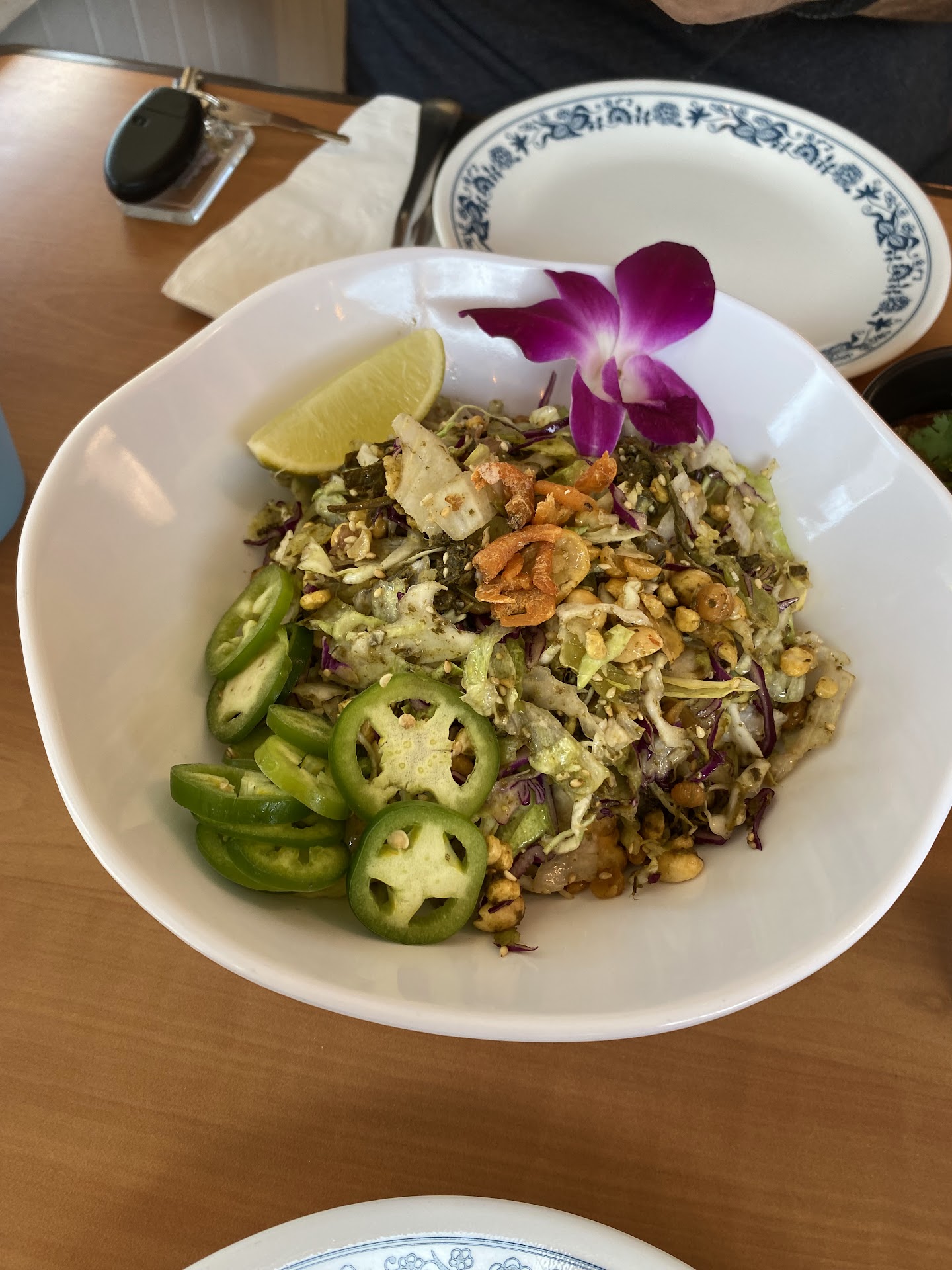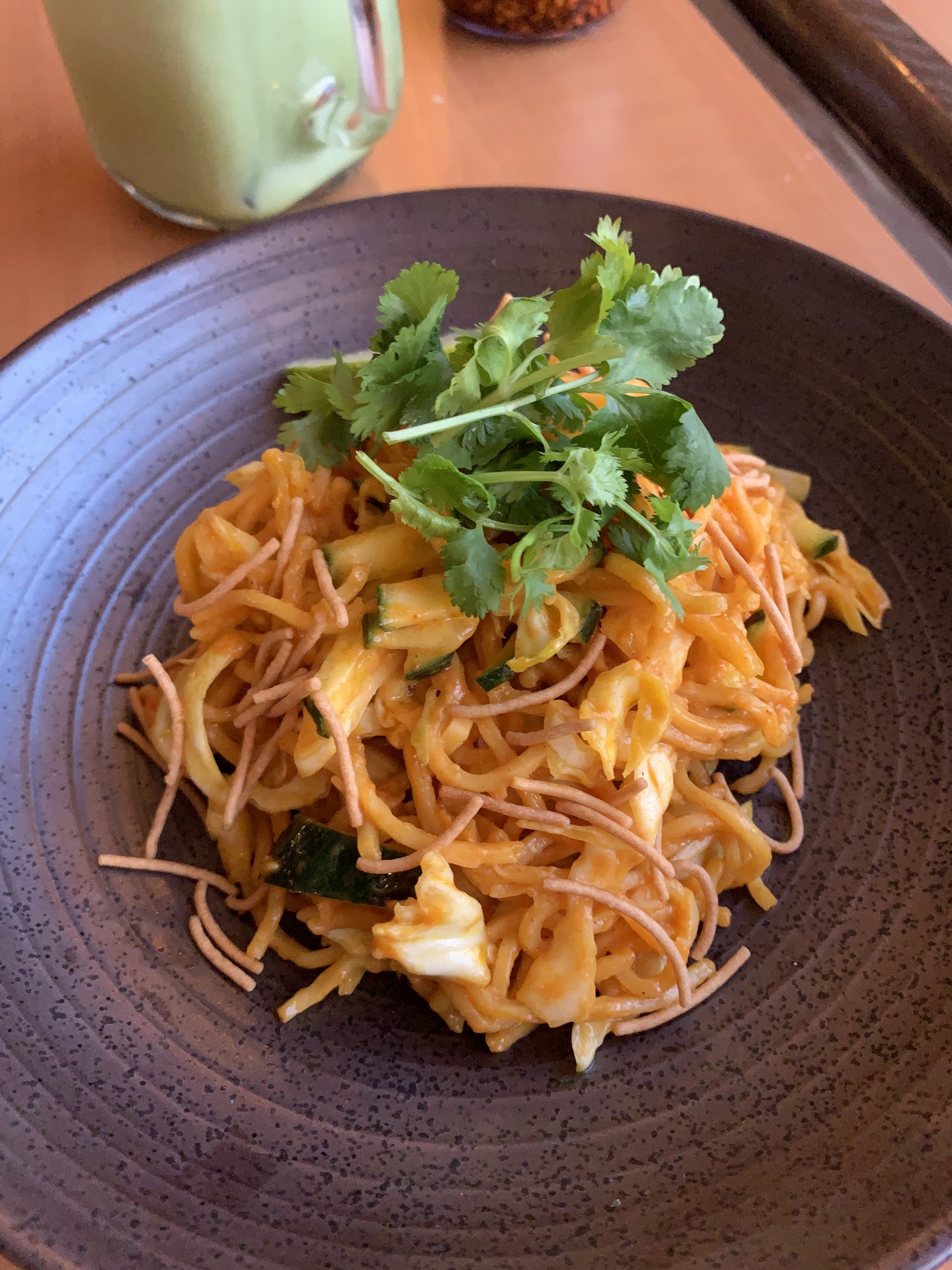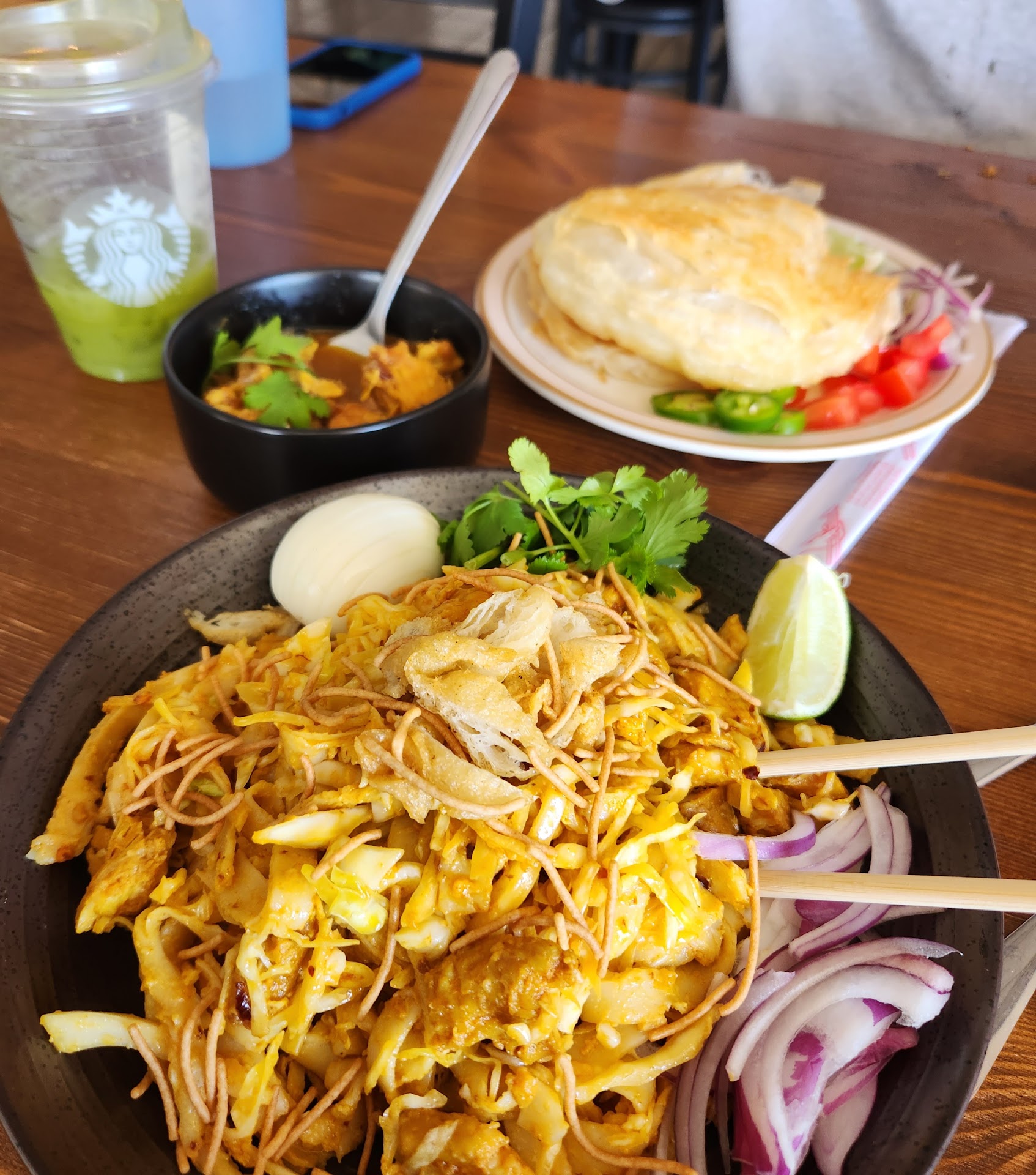 We ordered the tea leaf salad, rainbow salad, chicken curry, and a noodle dish. Everything just tasted the sameābland, too salty, and meh texture. The dried chili condiment was the only tasty thing we had.
