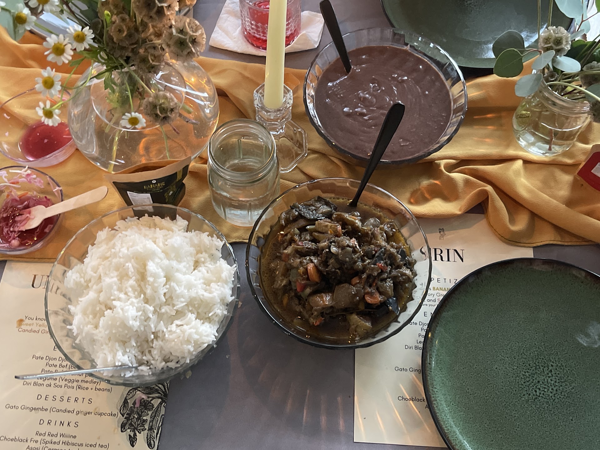 š½ļø Entrees: ⢠Pate Djon Djon (Mushroom Patty) ā A flaky puff pastry filled with oyster mushrooms, green onions, garlic, and tomatoes. ⢠Pate Bef (Beyond āBeefā Patty) ā Stuffed with Beyond Meat, red onions, garlic, bell peppers, and parsley. ⢠Legume (Veggie Medley) ā A delicious mash of spinach, chayote, eggplant, and tomatoes, slowly cooked to perfection. ⢠Diri Blan ak Sos Pois (Rice & Beans) ā Fluffy white rice with hints of clove and green onion, served with black bean sauce. ⢠Pikliz (Spicy Pickled Cabbage) ā A must-try! Adds the perfect spicy, tangy kick.