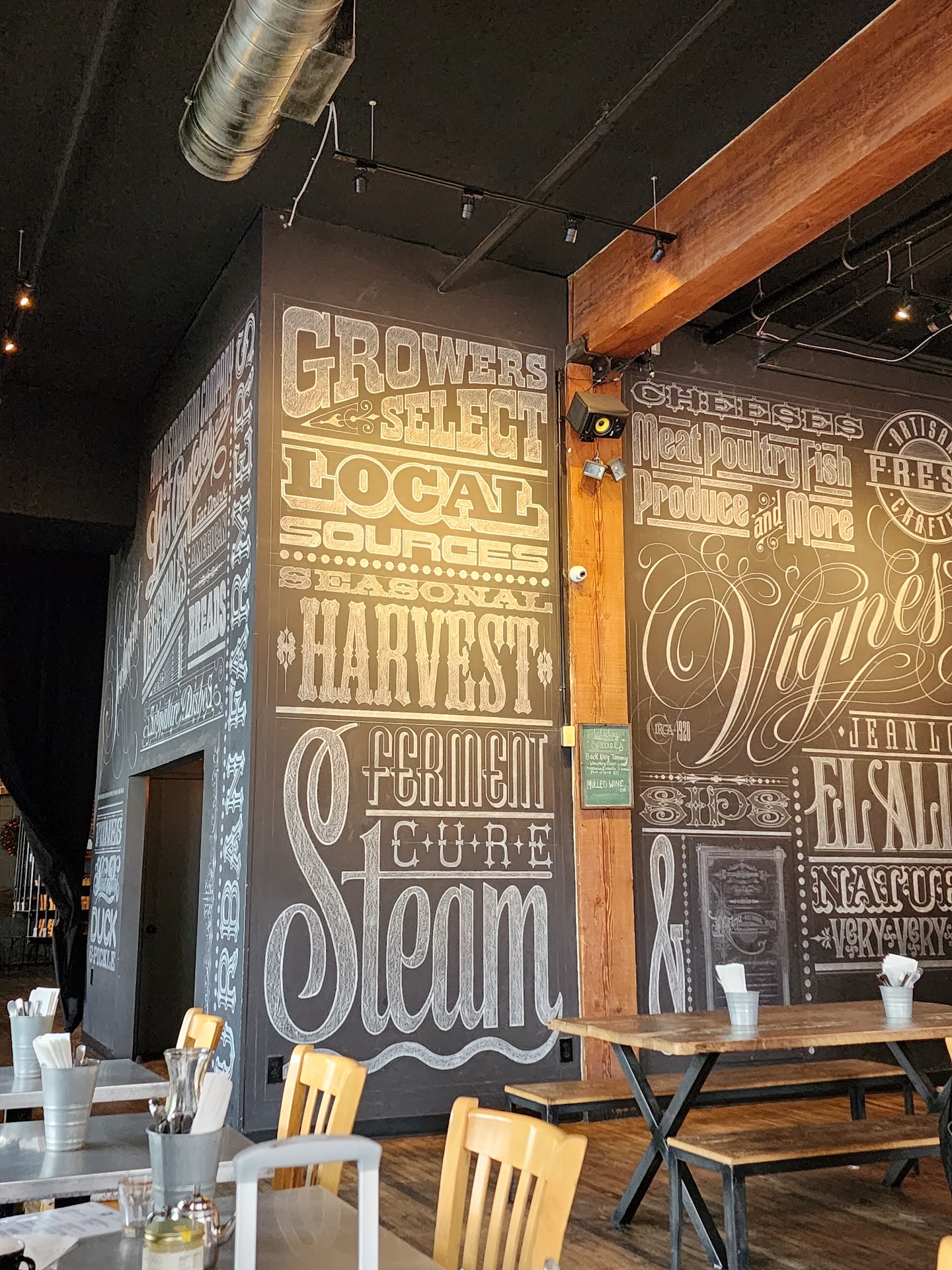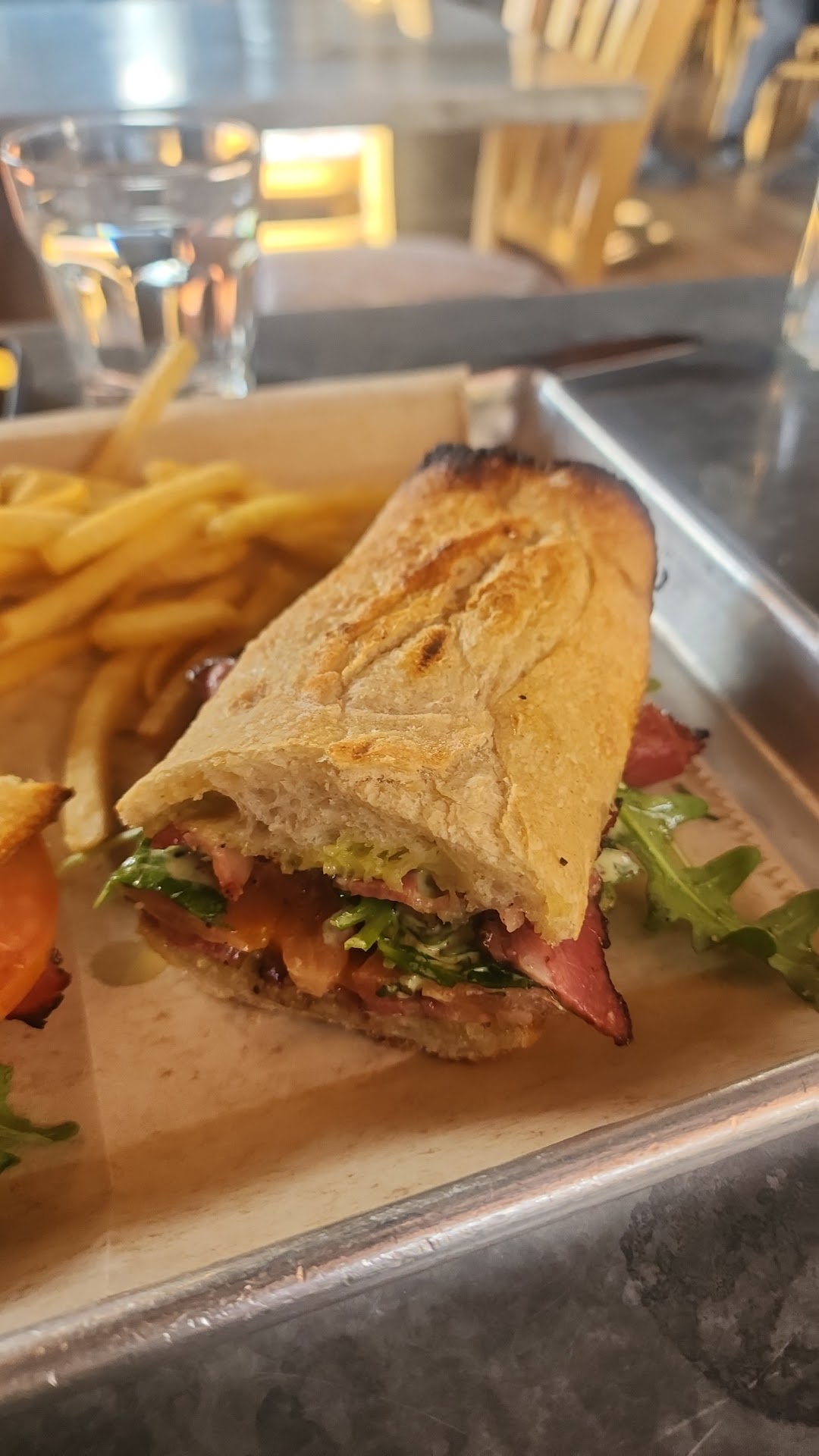 We were excited to try this place out as we are Lakers season tix holders and are tired of the LA Live options. The atmosphere is great! The food we ordered was actually good or had potential, except the Ceasar salad. It may have been ok when it was first made, but as we sat for 25 minutes after ordering without our server even coming by and asking if we needed another drink watching several tables around us that ordered way after us get their food, I finally flagged her down. I asked why the salad wasn't brought out yet, and she basically said, oh I thought you'd wanted everything at once. Obviously, this server has very little experience and wasn't trained properly. As a former restaurant owner, server/bartender myself and trainer, I told her, almost everyone wants soup/salad/appetizers 1st. And I wanted to tell her, it's not impressive to not write orders down because most servers get something wrong, but I refrained from schooling her. But she should ALWAYS ask how the guest wants the food to come out, especially when they order several items. The Ceasar salad was wilted, warm, tasteless and really an embarrassing item. You should just take it off the menu if your staff can't make it how you created it and if it's going to sit in the back to become mush. But the dressing itself was tasteless, absolutely no hint of poblanoes or a proper Ceaser dressing. So that was a disappointing beginning of our meal. And I was right, the server who thinks it's impressive to not write down details of an order, got our order wrong. We clearly ordered a half baguette and she even asked twice, so a full or half and we both said, half, but we got a full and we're charged for a full. Despite this mistake, the hot pastrami baguette was really good. We also ordered the pastrami Flatbread. It has potential but was a soggy mess. I had to eat the toppings and throw away the wet n soggy crust. Again, this is poor execution, not bad taste. One thing as a former chef, I'd suggest not putting super thick slices of tomatoes on the bottom. Also, crisp up the pastrami a bit because maybe it was also contributing to the sogginess. You should also maybe bake the Flatbread to a more crisp state, then top it. But again, it probably sat in the back waiting for other items as nothing on it was hot or even warm, my added egg on top was cooked to death, hard yolk, also weird a chef or cook would serve that. Flavors were there, but poorly executed, so so soggy flatbread. We ordered a side of fries, which were the best thing we had. They were hot, crispy, not greasy and perfect. The side of fried chicken had good flavor, but the breading was all falling off. As a seasoned fried chicken fryer, I will tell you, this is from excessive moisture before frying. You guys gotta start over on the breading process. What you're doing is not right. After I brine my chicken, I dry it and if I dip in egg batter or a batter of some type, I will still dip the pieces of chicken in a little flour and sit them on a wire rack and let them dry out a bit either on the counter for 15-20 min if I'm ready to fry or in a fridge, then I let the chicken sit for 15 min so I don't try to deep fry super cold chicken. But your breading has to be dry, needs a bit of time to dry out before you fry in oil or all your breading will fall off, which is what happens to your chicken. I read a few other reviews with the same complaint. The last thing that was super odd and uncomfortable was that when you pay, the server just brings you this credit card machine. No check, just a total. I am never going to feel comfortable paying $100+ bill without seeing it, even if it was $25, I want to see my check. This is obnoxious and honestly a very unethical way to ask diners to pay. You're put in an uncomfortable situation and even when we asked for the check the server acted like we were the obnoxious ones! As long as this is how you run this business, I won't be coming back to give it another try. It's just wrong, and I know others must...