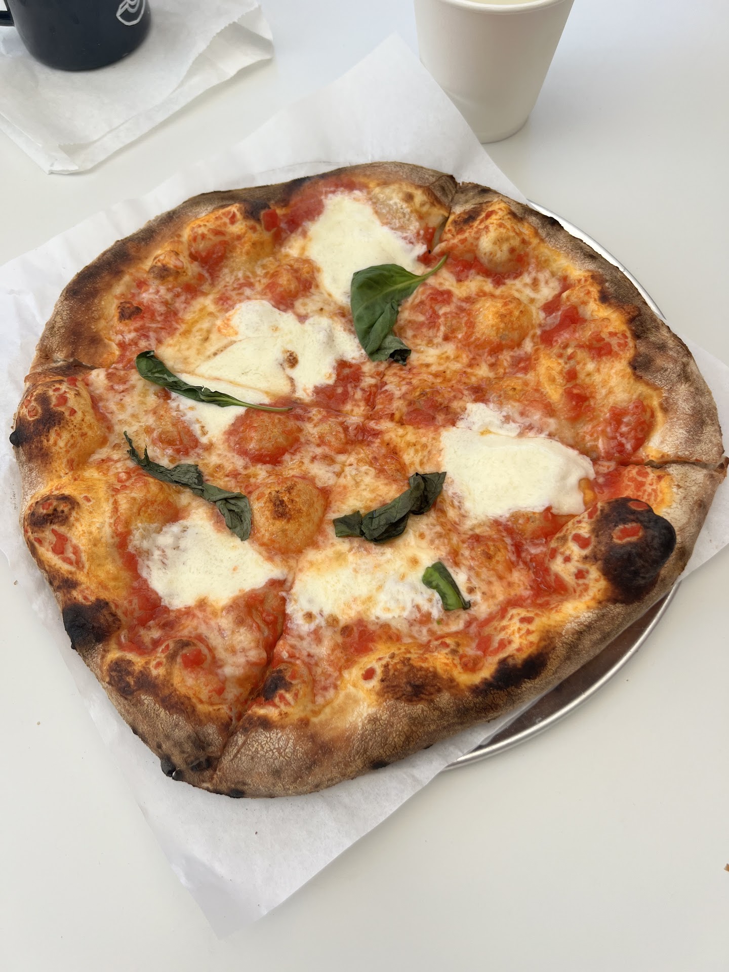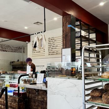 You know your barrister is a pro, when you ask how the coffee is? and the start with: "well when I dialed it In this morning"... hello? You dialed your coffee beans in? I'm a coffee snob. You have the right beans (which happens to be a custom South American blend, medium/bold with loads of nuttiness and a helping of amazing fruitiness/citrus), the right scale, tools and machine. I mean.. wow. What a machine. And then... the flavor. Oh my... I've literally just found the best coffee shop in LA. And that... is before the food! What on earth did we stumble on here! This brand new GEM of a cafe with a full size Italian pizza oven, with their hand tiled logo. That's just the start of the attention to detail. Spelt sourdough is usually dense and flat. Their 100% spelt SD is soft and has an incredible airy rise! The croissant is better than any I've tasted in the best parisian bakeries! I can't wait to come back for lunch as the pizza looks incredible. Did I mention the owner was super nice and is right there making the pizza - excited to make the pizza. Great cafe. Great location. My new spot for every...
