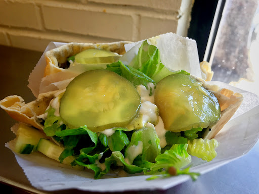 The salad/condiment bar is free for customers but based on reviews from the recent past (and the empty trays) it has clearly been cut back. Lettuce, tomatoes, onions, cucumbers, picked turnips, sliced pepperoncini, and the processed sliced pickles you put on burgers (i.e., not the authentic Middle Eastern pickles). There was also a variety of sauces in squeeze bottles. You also get a few pita triangles, but in the 5 minutes it took me to get home they'd already dried out to the point of being crackers...that was a first! Speaking of once I got home, when I opened the container there was a pool of oil and/or butter at the bottom. That's a huge gross-out thing for me.