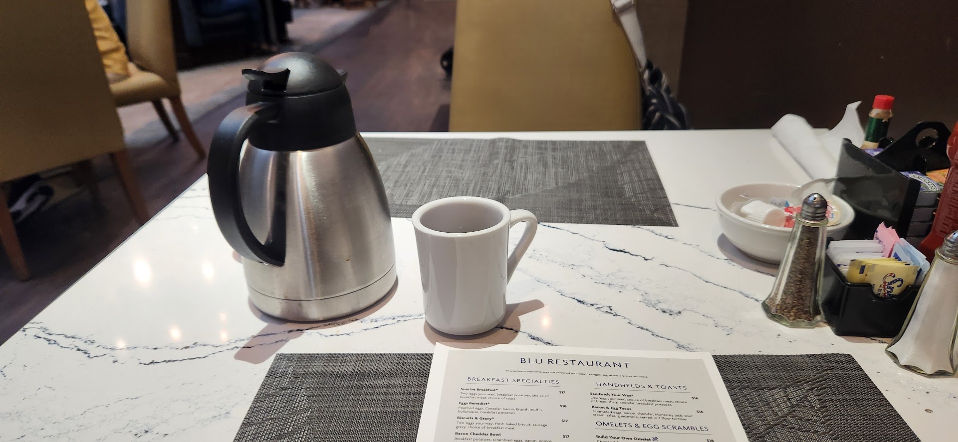 Previous visit: We had breakfast a BLU in San Pedro and the food was good but the service from Pedro and Genka was exceptional. What wonderful people. I had the Denver omelet with potatoes, sourdough toast and fruit with coffee and OJ and my wife had two eggs with oatmeal, fruit and hot tea. A nice morning with great people and good...
