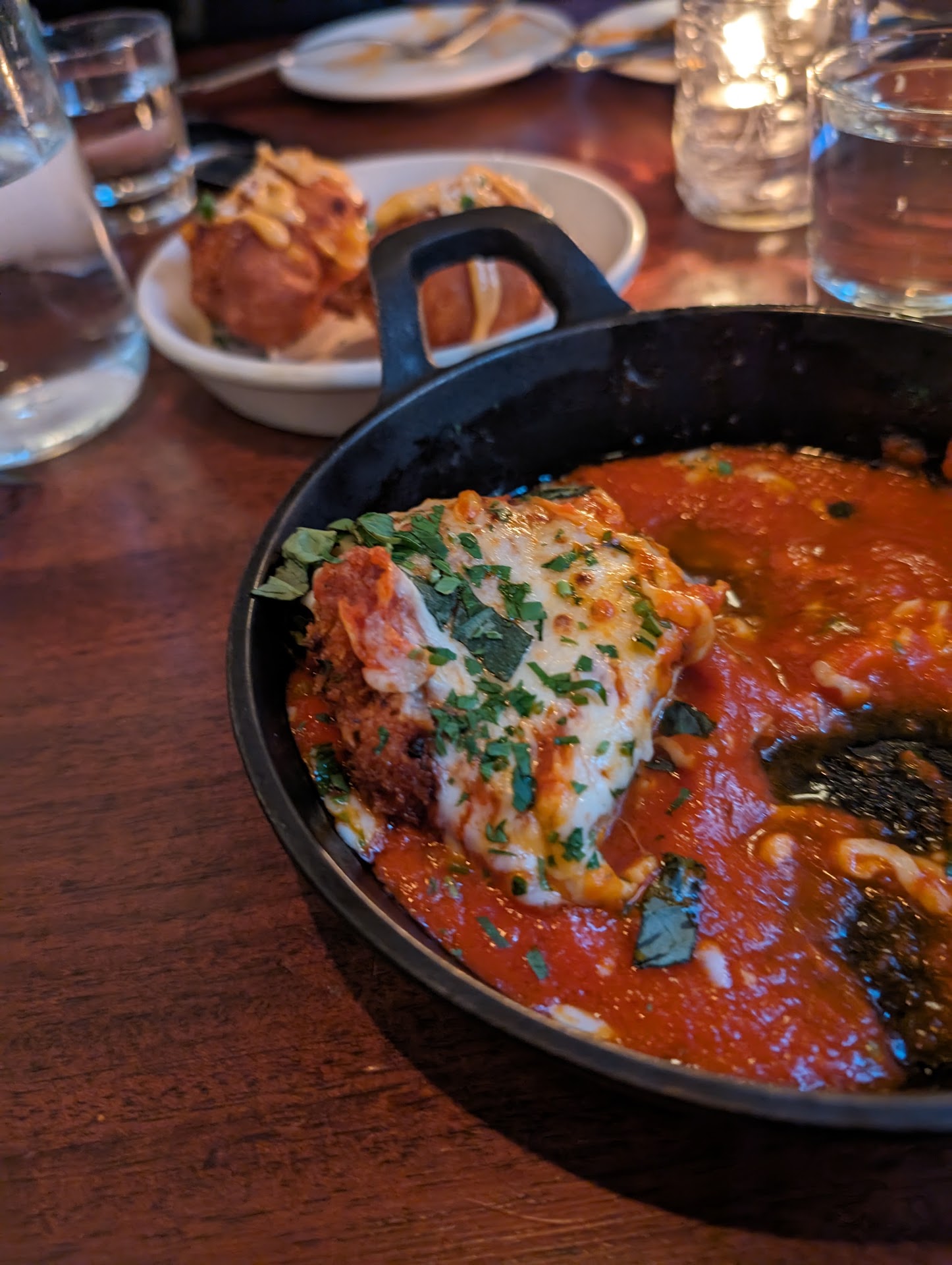 We started off with the Corn Fritters off the Happy Hour menu, perfection! They were light, flavorful, very well seasoned and not oily, like a lot of Fritters I have tried before. My son had 2 of the 3 ounce Sliders, cooker to the exact temp we asked for, juicy, flavorful with a perfectly toasted bun, only topping was Lettuce, come on he's only 9. My wife had the Penne and I had the Chicken Parm, both were amazing, again. Finally for dessert, we had the Churros, I love Churros and these were definitely among the best. The place is beautiful, has a true old pub feel to it, very charming.