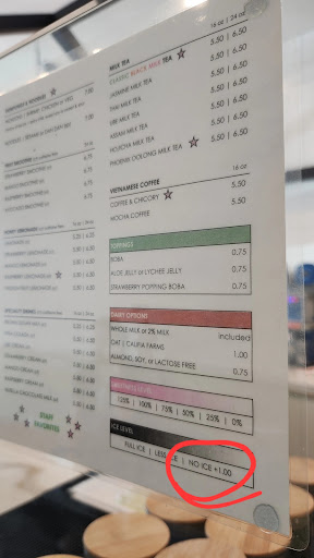 FYI #2 No, it is NOT the standard for a small "mom n pop boba place" to charge extra for no-ice in a drink and some...
