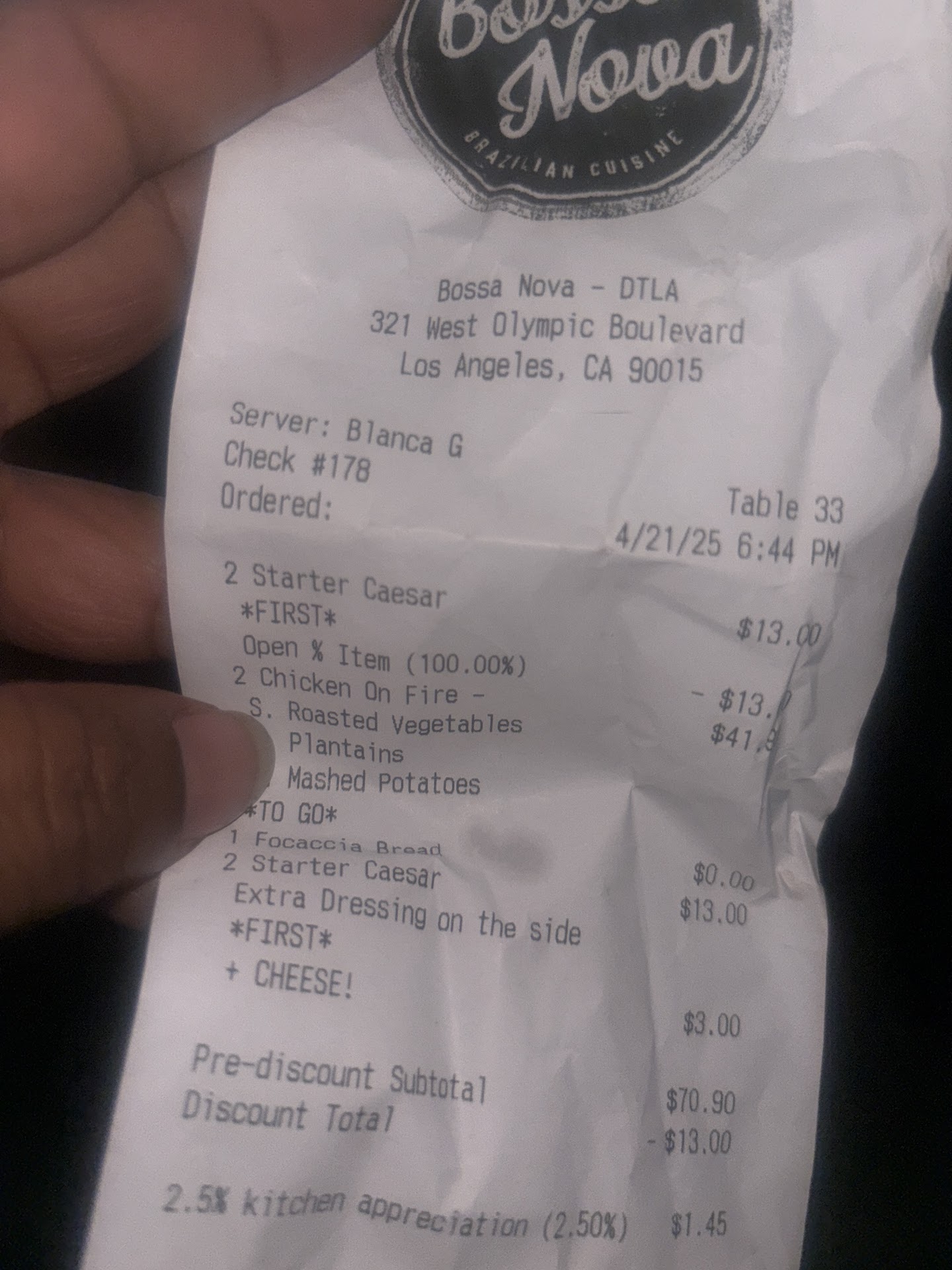 Read moreHello! I am a TV/Media personality had friends in town from Memphis wanted them to experience Bossanova but I wanted to try a new location that I have not been in La. Tonight I ate at Bossanova DTLA CHECK #178 . I was very disappointed In the food , Staff & establishment. I have only eaten at the Bossanova on Sunset, in which I love so I wanted to try a new location which was one of the worst decision I made. My friend and I ordered appetizer and entrees but entrees to go. The appetizer was a ceaser salad it was not fresh lettuce it was watered down so we ask to return for fresher lettuce ok. It was a not much better, Our server Blanca G was terrible she did not have good customer service at all. We spoke with manager on the appetizer, texture & how many times it was added on the bill . He was not very accommodating knowing how everything was then once we paid, we still gave a tip. When I was in college, I was a server I know how hard it is sometimes. We paid early for our food and was conversing and before we could get ourself together the waitress had the nerve to come over and ask us can we move to another table in the area cause a women at table next to us had a friend coming and she wanted to use our table not knowing we was finished with our food or not we was just paying earlier. I was furious, I was so disappointed but I will not be returning to the DTLA location! Horrible service, food was not fresh and bread was hard. So many things I can’t even type. I recommend the sunset location. Review the receipt it says it all. I will not return to this location& will be...