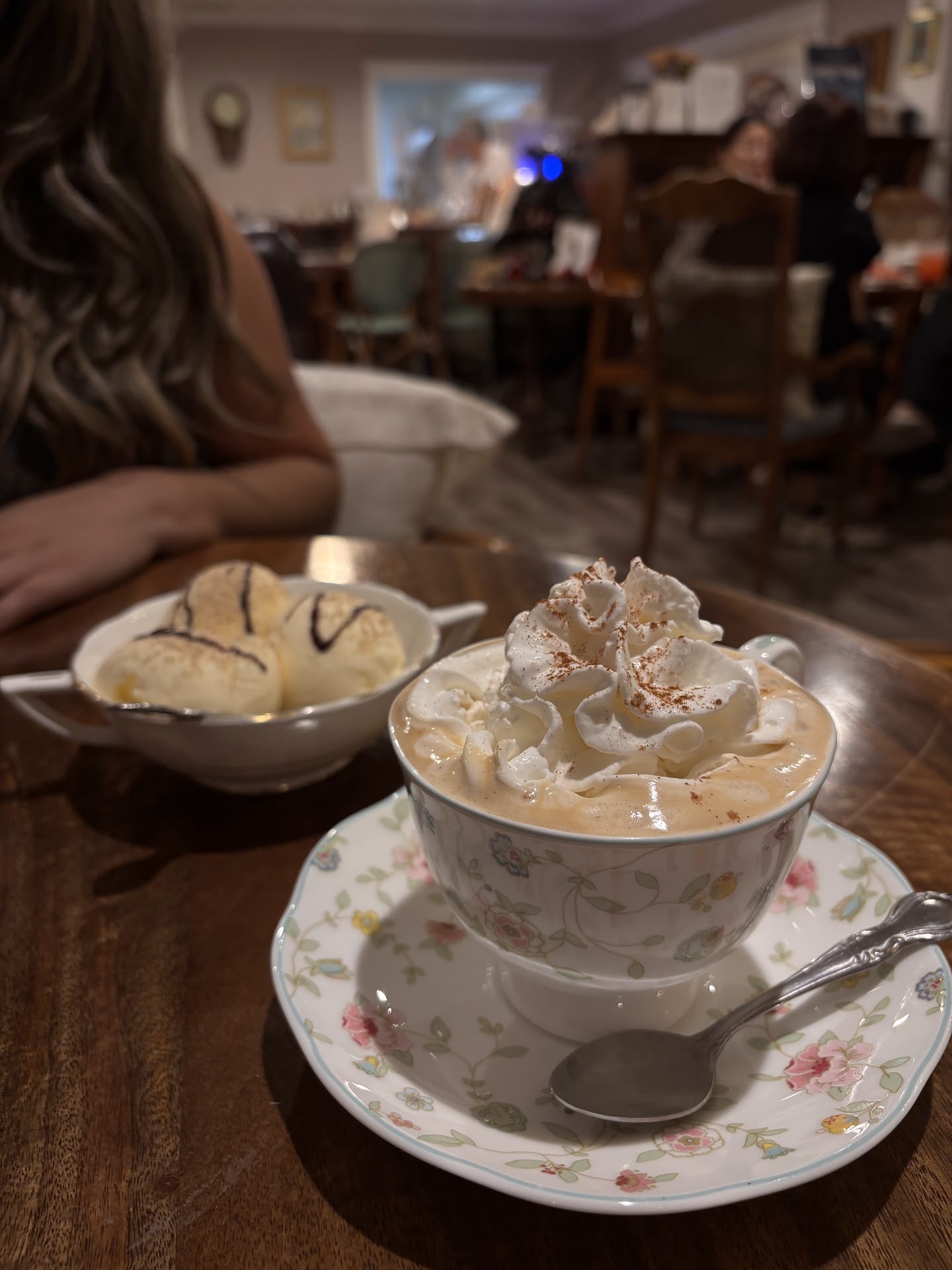 EXPERIENCE / FOOD / DRINK: I love the CAFFE LATTE, the last time I ordered this it came in a teacup that had a tiny bee decoration that emerged as I sipped it, served on a teacup dish that had a wee grasshopper on it. The POTS OF TEA are unique and if your party ordered one each, each teapot is likely different from each other and gorgeous. The STRAWBERRY SHORTCAKE slice is one of the best slices of cream and fresh berry cakes in town and we order it almost every time, the cream not too sweet, the cake airy and fluffy. The SALTED CARAMEL MACARON is the my personal favorite flavor of macaron, dainty sweet and delicious with a coffee drink. These are all so lovely enjoyed on the homey wooden tables and chairs, a mini grandfather clock nearby, or a piano overlooking your tea.