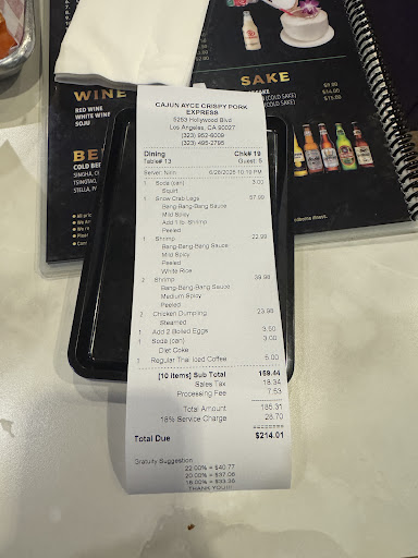 One more thing: the business seems to operate under multiple names. On the receipt, it’s called “Cajun Ayce Crispy Pork Express,” but Yelp and other platforms list names like “Cajun Seafood House.” They appear to close and reopen under different names, which makes it hard to track reviews or hold them accountable.