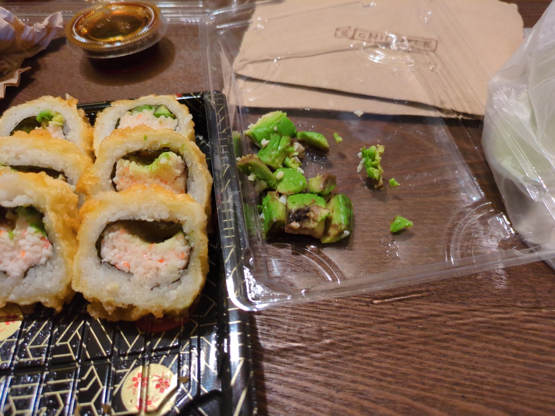 Read moreIm usually pretty happy with what I get from any of these locations... But this one truly disappointed me. To start, my ACTUAL order was a chicken Bowl, not a bento. I let that one slide. What disappointed the most was that the tempura California rolls had the rotting avocado in them but the regular California rolls look pristine. I'm sure one might say" oh but it's cause they got deep fried". No. ANY other location I've ordered from, they NEVER look like this. And they forgot the sauces that correspond even after asking to have them on the side. I'm willing to give this spot another chance if they do things properly. Cause if this shit happens again, I'm not...