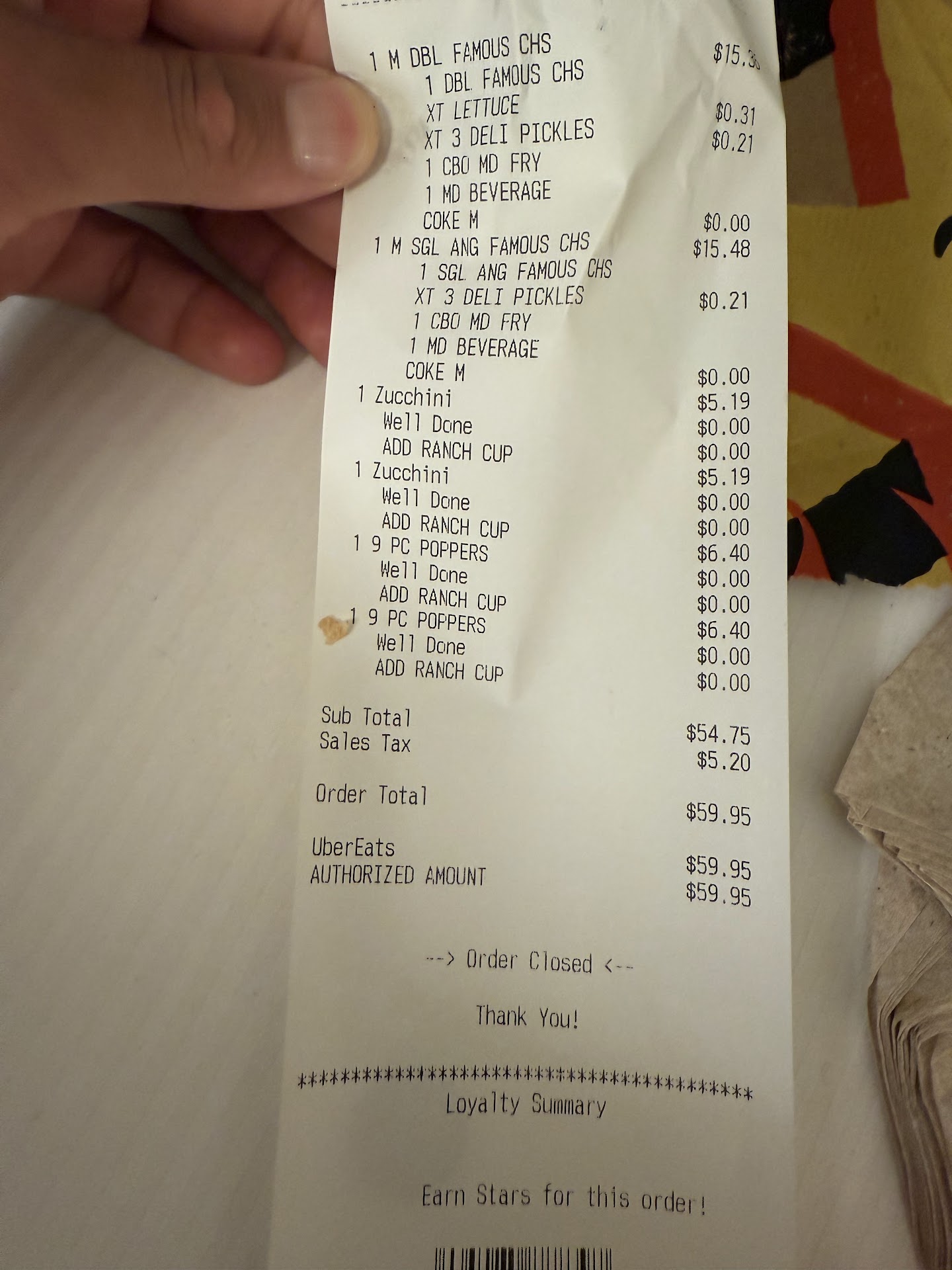But wait — it gets better. I remembered they’re on Uber Eats. I think, okay, maybe I can still enjoy what I came for. I place a $60 order, add tons of sauces, especially ranch (which I was seriously craving), thinking it’ll make up for the nightmare I just went through.