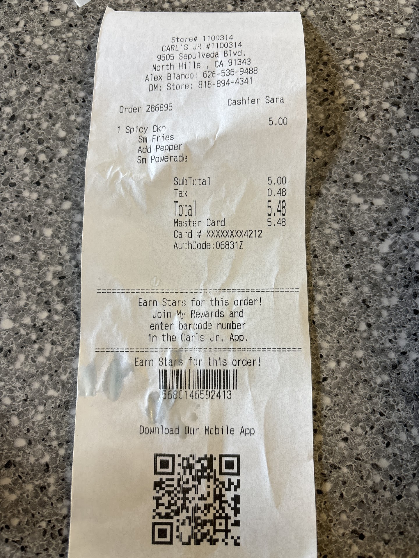Read moreI've been eating carls jr since I was a child and let me tell you I've been to many locations over 100 in Los Angeles easily. This location is by far the worst absolutely unacceptable disgusting location I've been too. First off I go in to get my food to be slowly attended to after ordering i go and wait for my food in the dining area there's this old ripped carpet on the floor cigarette stains burns on the tables and booths.everything is old and run down and smells worst than most bars with a smell of bleach and fabuloso to blast the dingy smell of the old un vacuumed carpet that should have been replaced with adequate flooring I'd say 30 years ago. So now I'm nauseous just from the scent and honestly lost appetite. While my order took almost 15 minutes to come out. I get my food and jam because there's no way I feel okay eating there inhaling that stench. Food was ordered with the extra guacamole which I payed for and it was not at all guacamole it tasted like a watered down mix up of old avocado that was clear green liquid with onions and a hint of fabuloso mixed in there. I'm never putting out bad reviews because most places are up to standards but this spot go inside have a feel of the atmosphere you...